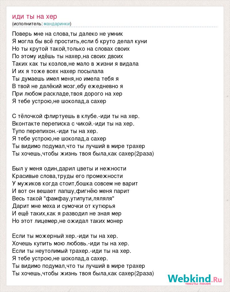 Поверь мне на слова,ты далеко не умник Я могла бы всё простить,если б круто делал куни Но ты крутой такой,только на словах своих По этому идёшь ты нахер,на своих двоих Таких как ты козлов,не мало в жизни я видала И их я тоже всех нахер посылала Ты думаешь имел меня,но имела тебя я В твой не далёкий мозг,ебу ежедневно я При любом раскладе,твоя дорого на хер Я тебе устрою,не шоколад,а сахер С тёлочкой флиртуешь в клубе.-иди ты на хер. Вконтакте переписка с чикой.-иди ты на хер. Тупо перепихон.-иди ты на хер. Я тебе устрою,не шоколад,а сахер Ты видимо подумал,что ты лучший в мире трахер Ты хочешь,чтобы жизнь твоя была,как сахер(2раза) Был у меня один,дарил цветы и нежности Красивые слова,труды его промежности У мужиков когда стоит,бошка совсем не варит И вот он вешает лапшу,фигнёю меня парит Весь такой "фамфау,утипути,ляляля" Дарит мне меха и сумочки от кутюрья И ещё таких,как я разводил не зная мер Но этот лицемер,не ожидал таких монер Если ты можерный хер.-иди ты на хер. Хочешь купить мою любовь.-иди ты на хер. Если ты неутолимый трахер.-иди ты на хер. Я тебе устрою,не шоколад,а сахер. Ты видимо подумал,что ты лучший в мире трахер Ты хочешь,чтобы жизнь твоя была,как сахер(2раза)
