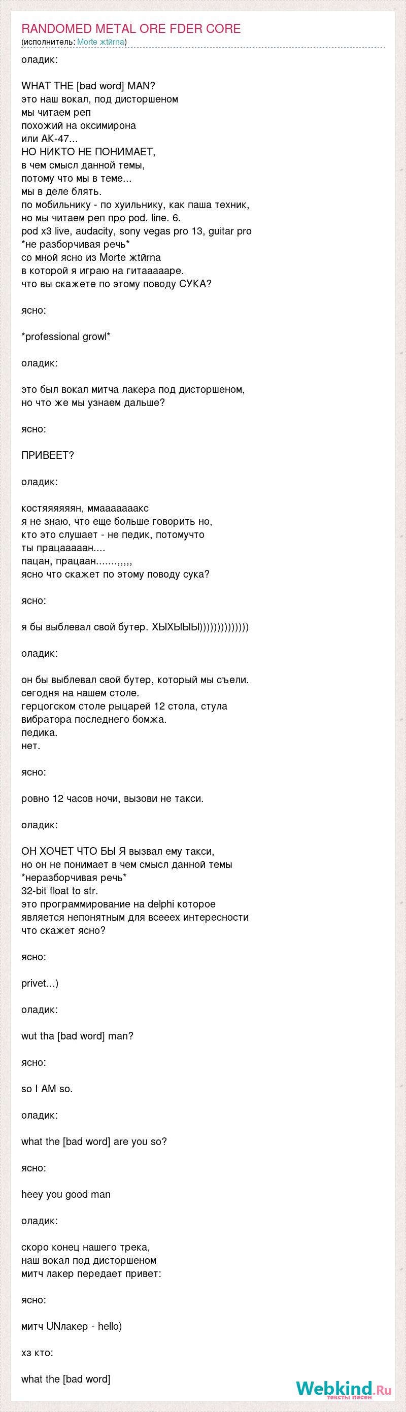 оладик: WHAT THE [bad word] MAN? это наш вокал, под дисторшеном мы читаем реп похожий на оксимирона или АК-47... НО НИКТО НЕ ПОНИМАЕТ, в чем смысл данной темы, потому что мы в теме... мы в деле блять. по мобильнику - по хуильнику, как паша техник, но мы читаем реп про pod. line. 6. pod x3 live, audacity, sony vegas pro 13, guitar pro *не разборчивая речь* cо мной ясно из Morte жtйrna в которой я играю на гитаааааре. что вы скажете по этому поводу СУКА? ясно: *professional growl* оладик: это был вокал митча лакера под дисторшеном, но что же мы узнаем дальше? ясно: ПРИВЕЕТ? оладик: костяяяяяян, ммааааааакс я не знаю, что еще больше говорить но, кто это слушает - не педик, потомучто ты працааааан.... пацан, працаан.......,,,,, ясно что скажет по этому поводу сука? ясно: я бы выблевал свой бутер. ХЫХЫЫЫ)))))))))))))) оладик: он бы выблевал свой бутер, который мы съели. сегодня на нашем столе. герцогском столе рыцарей 12 стола, стула вибратора последнего бомжа. педика. нет. ясно: ровно 12 часов ночи, вызови не такси. оладик: ОН ХОЧЕТ ЧТО БЫ Я вызвал ему такси, но он не понимает в чем смысл данной темы *неразборчивая речь* 32-bit float to str. это программирование на delphi которое является непонятным для всееех интересности что скажет ясно? ясно: privet...) оладик: wut tha [bad word] man? ясно: so I AM so. оладик: what the [bad word] are you so? ясно: heey you good man оладик: cкоро конец нашего трека, наш вокал под дисторшеном митч лакер передает привет: ясно: митч UNлакер - hello) хз кто: what the [bad word]