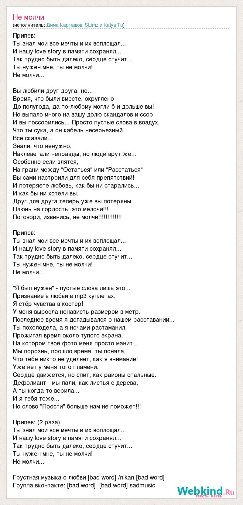 Припев: Ты знал мои все мечты и их воплощал... И нашу love story в памяти сохранял... Так трудно быть далеко, сердце стучит... Ты нужен мне, ты не молчи! Не молчи... Вы любили друг друга, но... Время, что были вместе, округлено До полугода, да по-любому могли б и дольше вы! Но выпало много на вашу долю скандалов и ссор И вы поссорились... Просто пустые слова в воздух, Что ты сука, а он кабель несерьезный. Всё сказали... Знали, что ненужно, Наклеветали неправды, но люди врут же... Особенно если злятся, На грани между "Остаться" или "Расстаться" Вы сами настроили для себя препятствий! И потеряете любовь, как бы ни старались... И как бы ни хотели вы, Друг для друга теперь уже вы потеряны... Плюнь на гордость, это мелочи!!! Поговори, извинись, не молчи!!!!!!!!!!!!! Припев: Ты знал мои все мечты и их воплощал... И нашу love story в памяти сохранял... Так трудно быть далеко, сердце стучит... Ты нужен мне, ты не молчи! Не молчи... "Я был нужен" - пустые слова лишь это... Признание в любви в mp3 куплетах, Я стёр чувства в костер! У меня выросла ненависть размером в метр. Последнее время я догадывался о нашем расставании... Ты похолодела, а я ночами растаманил, Прожигая время около тупого экрана, На котором твоё фото меня просто манит... Мы порознь, прошло время, ты поняла, Что тебе никто не уделяет, как я внимание! Уже нет у меня того пламени, Сердце движется, но спит, как районы спальные. Дефолиант - мы пали, как листья с дерева, А ты когда-то верила... И я тебя тоже... Но слово "Прости" больше нам не поможет!!! Припев: (2 раза) Ты знал мои все мечты и их воплощал... И нашу love story в памяти сохранял... Так трудно быть далеко, сердце стучит... Ты нужен мне, ты не молчи! Не молчи... Грустная музыка о любви [bad word] /nikan [bad word] Группа вконтакте: [bad word] [bad word] sadmusic