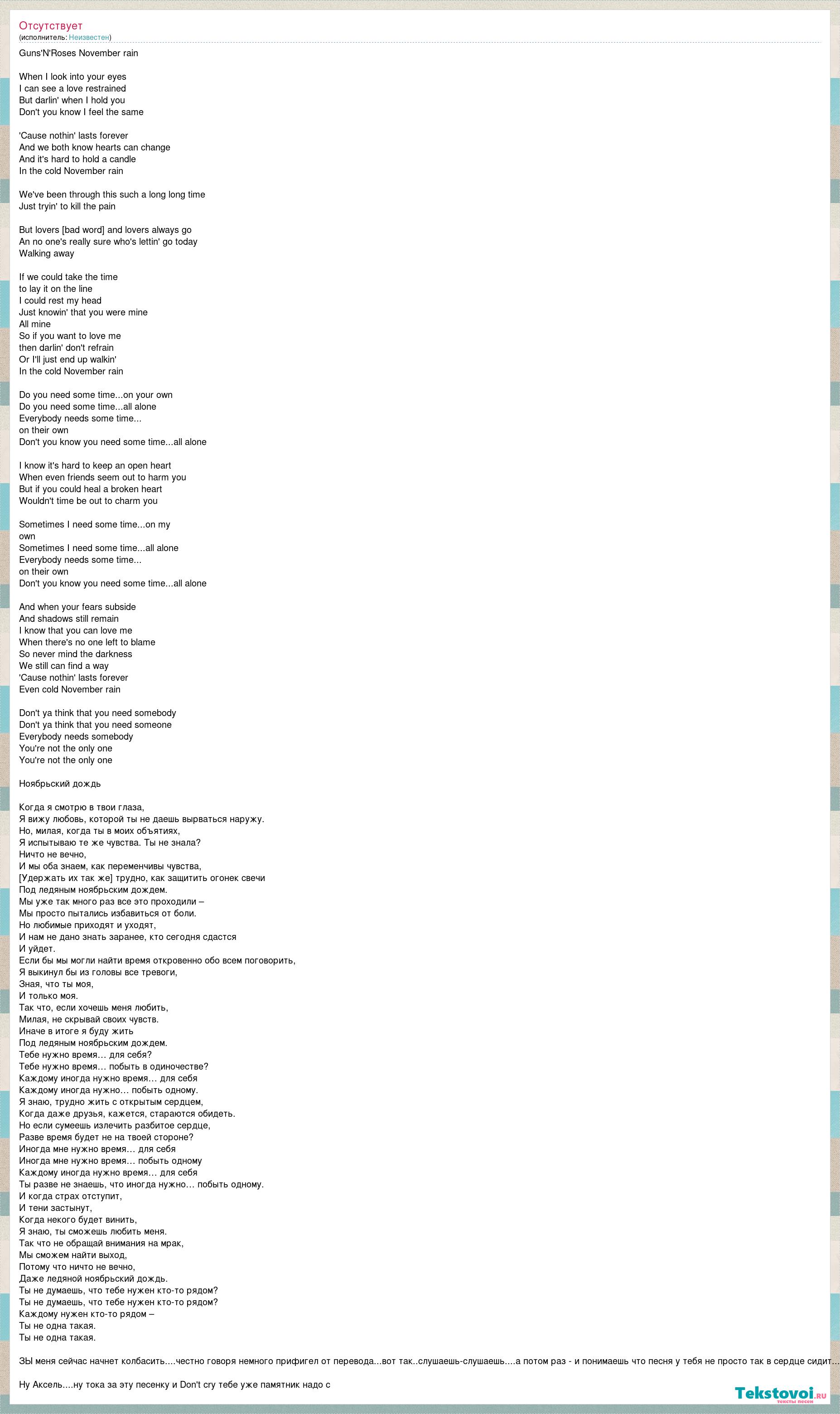 Guns'N'Roses November rain When I look into your eyes I can see a love restrained But darlin' when I hold you Don't you know I feel the same 'Cause nothin' lasts forever And we both know hearts can change And it's hard to hold a candle In the cold November rain We've been through this such a long long time Just tryin' to kill the pain But lovers always come and lovers always go An no one's really sure who's lettin' go today Walking away If we could take the time to lay it on the line I could rest my head Just knowin' that you were mine All mine So if you want to love me then darlin' don't refrain Or I'll just end up walkin' In the cold November rain Do you need some time...on your own Do you need some time...all alone Everybody needs some time... on their own Don't you know you need some time...all alone I know it's hard to keep an open heart When even friends seem out to harm you But if you could heal a broken heart Wouldn't time be out to charm you Sometimes I need some time...on my own Sometimes I need some time...all alone Everybody needs some time... on their own Don't you know you need some time...all alone And when your fears subside And shadows still remain I know that you can love me When there's no one left to blame So never mind the darkness We still can find a way 'Cause nothin' lasts forever Even cold November rain Don't ya think that you need somebody Don't ya think that you need someone Everybody needs somebody You're not the only one You're not the only one Ноябрьский дождь Когда я смотрю в твои глаза, Я вижу любовь, которой ты не даешь вырваться наружу. Но, милая, когда ты в моих объятиях, Я испытываю те же чувства. Ты не знала? Ничто не вечно, И мы оба знаем, как переменчивы чувства, [Удержать их так же] трудно, как защитить огонек свечи Под ледяным ноябрьским дождем. Мы уже так много раз все это проходили – Мы просто пытались избавиться от боли. Но любимые приходят и уходят, И нам не дано знать заранее, кто сегодня сдастся И уйдет. Если бы мы могли найти время откровенно обо всем поговорить, Я выкинул бы из головы все тревоги, Зная, что ты моя, И только моя. Так что, если хочешь меня любить, Милая, не скрывай своих чувств. Иначе в итоге я буду жить Под ледяным ноябрьским дождем. Тебе нужно время… для себя? Тебе нужно время… побыть в одиночестве? Каждому иногда нужно время… для себя Каждому иногда нужно… побыть одному. Я знаю, трудно жить с открытым сердцем, Когда даже друзья, кажется, стараются обидеть. Но если сумеешь излечить разбитое сердце, Разве время будет не на твоей стороне? Иногда мне нужно время… для себя Иногда мне нужно время… побыть одному Каждому иногда нужно время… для себя Ты разве не знаешь, что иногда нужно… побыть одному. И когда страх отступит, И тени застынут, Когда некого будет винить, Я знаю, ты сможешь любить меня. Так что не обращай внимания на мрак, Мы сможем найти выход, Потому что ничто не вечно, Даже ледяной ноябрьский дождь. Ты не думаешь, что тебе нужен кто-то рядом? Ты не думаешь, что тебе нужен кто-то рядом? Каждому нужен кто-то рядом – Ты не одна такая. Ты не одна такая. ЗЫ меня сейчас начнет колбасить....честно говоря немного прифигел от перевода...вот так..слушаешь-слушаешь....а потом раз - и понимаешь что песня у тебя не просто так в сердце сидит... Ну Аксель....ну тока за эту песенку и Don't cry тебе уже памятник надо с