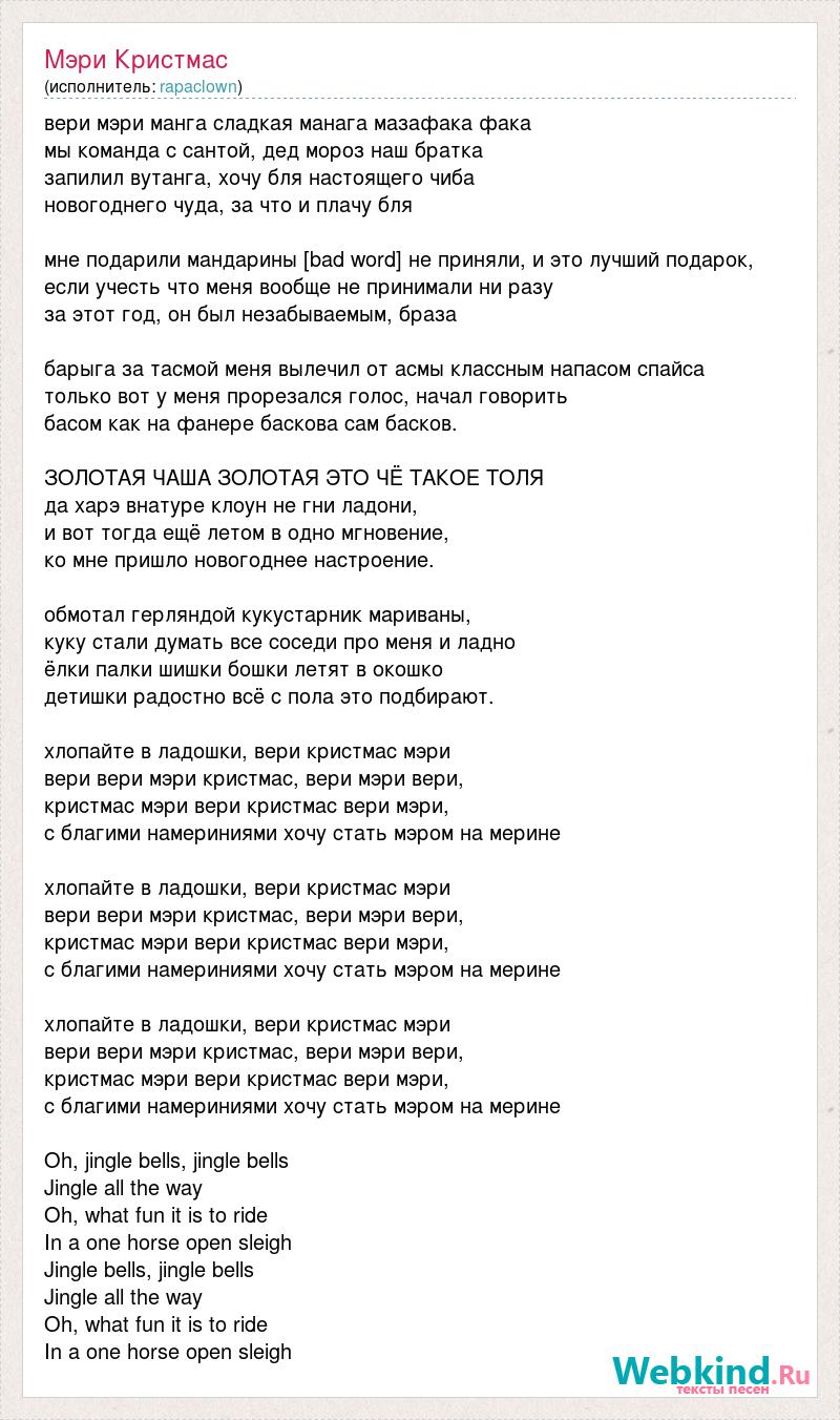 вери мэри манга сладкая манага мазафака фака мы команда с сантой, дед мороз наш братка запилил вутанга, хочу бля настоящего чиба новогоднего чуда, за что и плачу бля мне подарили мандарины [bad word] не приняли, и это лучший подарок, если учесть что меня вообще не принимали ни разу за этот год, он был незабываемым, браза барыга за тасмой меня вылечил от асмы классным напасом спайса только вот у меня прорезался голос, начал говорить басом как на фанере баскова сам басков. ЗОЛОТАЯ ЧАША ЗОЛОТАЯ ЭТО ЧЁ ТАКОЕ ТОЛЯ да харэ внатуре клоун не гни ладони, и вот тогда ещё летом в одно мгновение, ко мне пришло новогоднее настроение. обмотал герляндой кукустарник мариваны, куку стали думать все соседи про меня и ладно ёлки палки шишки бошки летят в окошко детишки радостно всё с пола это подбирают. хлопайте в ладошки, вери кристмас мэри вери вери мэри кристмас, вери мэри вери, кристмас мэри вери кристмас вери мэри, с благими намериниями хочу стать мэром на мерине хлопайте в ладошки, вери кристмас мэри вери вери мэри кристмас, вери мэри вери, кристмас мэри вери кристмас вери мэри, с благими намериниями хочу стать мэром на мерине хлопайте в ладошки, вери кристмас мэри вери вери мэри кристмас, вери мэри вери, кристмас мэри вери кристмас вери мэри, с благими намериниями хочу стать мэром на мерине Oh, jingle bells, jingle bells Jingle all the way Oh, what fun it is to ride In a one horse open sleigh Jingle bells, jingle bells Jingle all the way Oh, what fun it is to ride In a one horse open sleigh