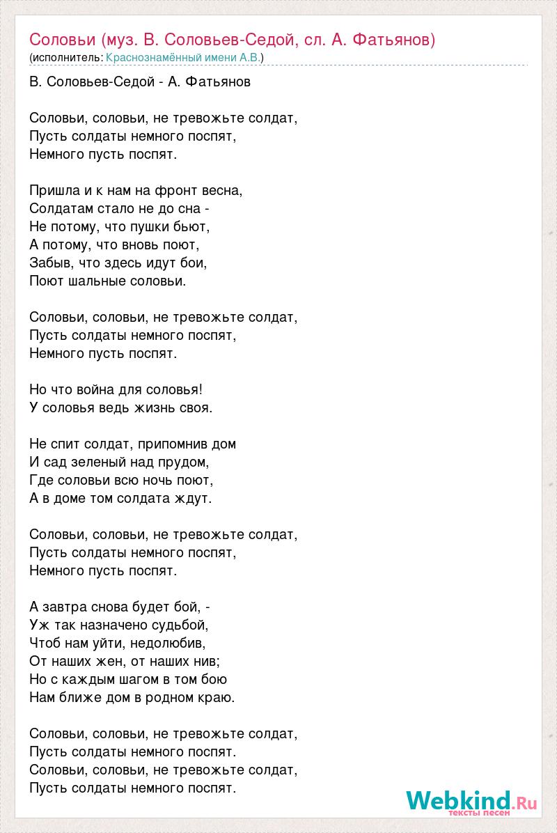 В. Соловьев-Седой - А. Фатьянов Соловьи, соловьи, не тревожьте солдат, Пусть солдаты немного поспят, Немного пусть поспят. Пришла и к нам на фронт весна, Солдатам стало не до сна - Не потому, что пушки бьют, А потому, что вновь поют, Забыв, что здесь идут бои, Поют шальные соловьи. Соловьи, соловьи, не тревожьте солдат, Пусть солдаты немного поспят, Немного пусть поспят. Но что война для соловья! У соловья ведь жизнь своя. Не спит солдат, припомнив дом И сад зеленый над прудом, Где соловьи всю ночь поют, А в доме том солдата ждут. Соловьи, соловьи, не тревожьте солдат, Пусть солдаты немного поспят, Немного пусть поспят. А завтра снова будет бой, - Уж так назначено судьбой, Чтоб нам уйти, недолюбив, От наших жен, от наших нив; Но с каждым шагом в том бою Нам ближе дом в родном краю. Соловьи, соловьи, не тревожьте солдат, Пусть солдаты немного поспят. Соловьи, соловьи, не тревожьте солдат, Пусть солдаты немного поспят.