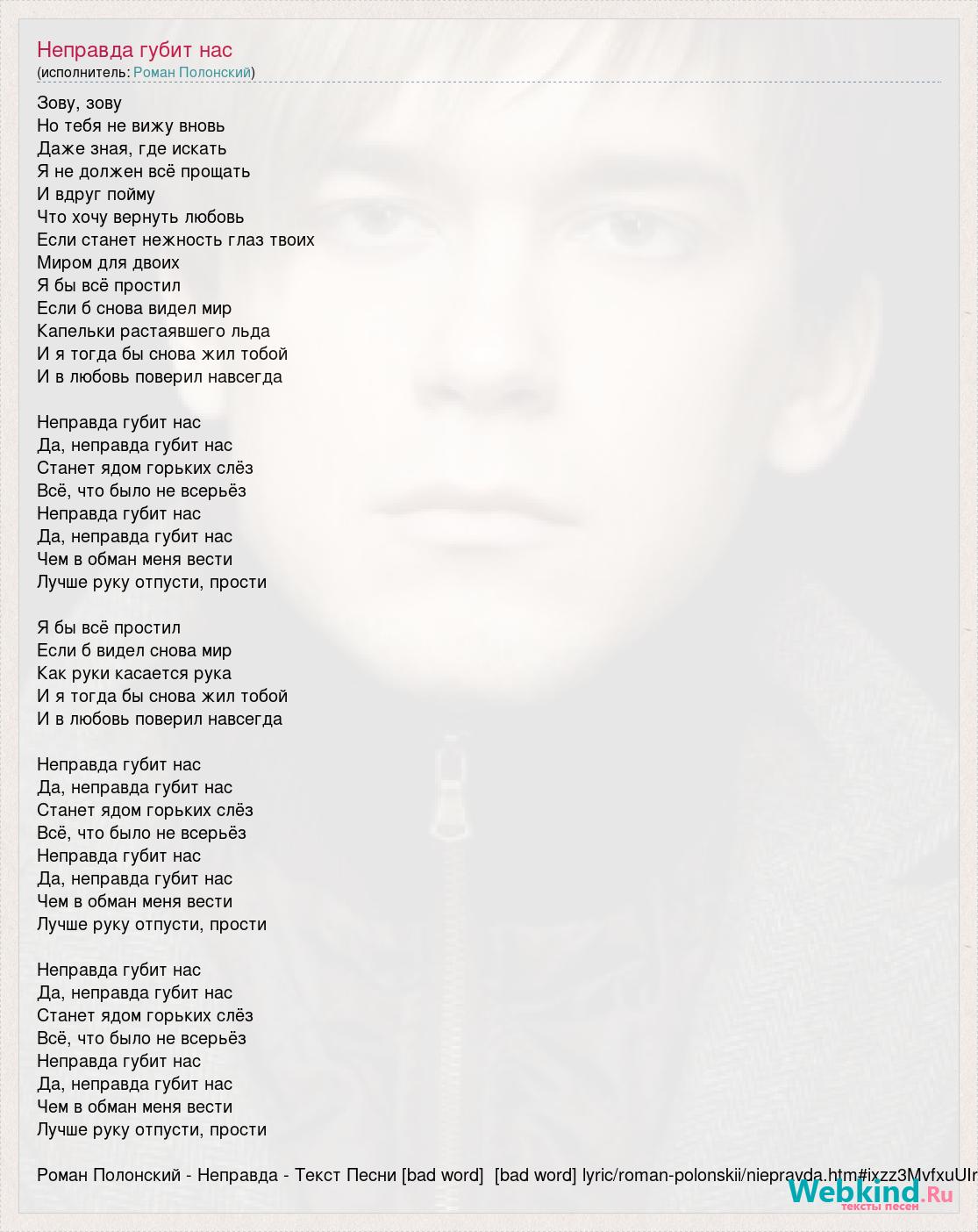 Зову, зову Но тебя не вижу вновь Даже зная, где искать Я не должен всё прощать И вдруг пойму Что хочу вернуть любовь Если станет нежность глаз твоих Миром для двоих Я бы всё простил Если б снова видел мир Капельки растаявшего льда И я тогда бы снова жил тобой И в любовь поверил навсегда Неправда губит нас Да, неправда губит нас Станет ядом горьких слёз Всё, что было не всерьёз Неправда губит нас Да, неправда губит нас Чем в обман меня вести Лучше руку отпусти, прости Я бы всё простил Если б видел снова мир Как руки касается рука И я тогда бы снова жил тобой И в любовь поверил навсегда Неправда губит нас Да, неправда губит нас Станет ядом горьких слёз Всё, что было не всерьёз Неправда губит нас Да, неправда губит нас Чем в обман меня вести Лучше руку отпусти, прости Неправда губит нас Да, неправда губит нас Станет ядом горьких слёз Всё, что было не всерьёз Неправда губит нас Да, неправда губит нас Чем в обман меня вести Лучше руку отпусти, прости Роман Полонский - Неправда - Текст Песни [bad word] [bad word] lyric/roman-polonskii/niepravda.htm#ixzz3MvfxuUIr