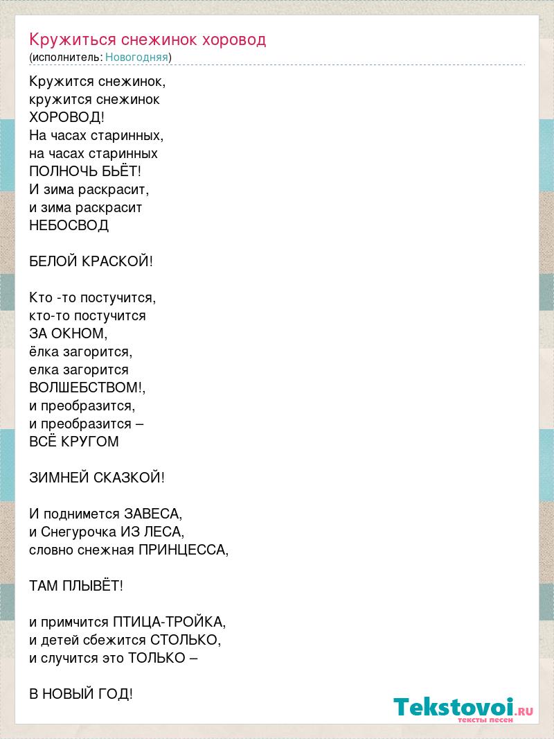 Кружится снежинок, кружится снежинок ХОРОВОД! На часах старинных, на часах старинных ПОЛНОЧЬ БЬЁТ! И зима раскрасит, и зима раскрасит НЕБОСВОД БЕЛОЙ КРАСКОЙ! Кто -то постучится, кто-то постучится ЗА ОКНОМ, ёлка загорится, елка загорится ВОЛШЕБСТВОМ!, и преобразится, и преобразится – ВСЁ КРУГОМ ЗИМНЕЙ СКАЗКОЙ! И поднимется ЗАВЕСА, и Снегурочка ИЗ ЛЕСА, словно снежная ПРИНЦЕССА, ТАМ ПЛЫВЁТ! и примчится ПТИЦА-ТРОЙКА, и детей сбежится СТОЛЬКО, и случится это ТОЛЬКО – В НОВЫЙ ГОД!