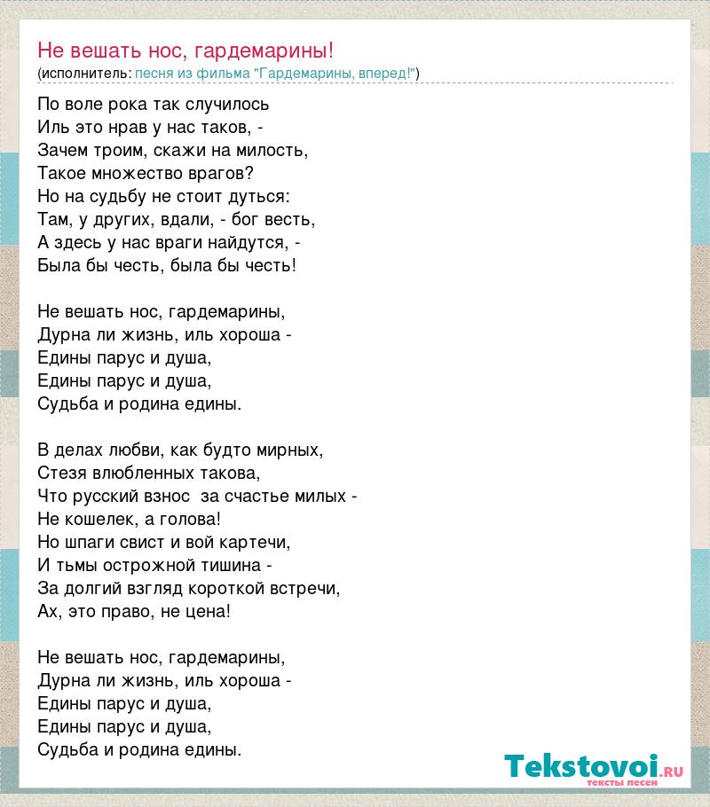 По воле рока так случилось Иль это нрав у нас таков, - Зачем троим, скажи на милость, Такое множество врагов? Но на судьбу не стоит дуться: Там, у других, вдали, - бог весть, А здесь у нас враги найдутся, - Была бы честь, была бы честь! Не вешать нос, гардемарины, Дурна ли жизнь, иль хороша - Едины парус и душа, Едины парус и душа, Судьба и родина едины. В делах любви, как будто мирных, Стезя влюбленных такова, Что русский взнос за счастье милых - Не кошелек, а голова! Но шпаги свист и вой картечи, И тьмы острожной тишина - За долгий взгляд короткой встречи, Ах, это право, не цена! Не вешать нос, гардемарины, Дурна ли жизнь, иль хороша - Едины парус и душа, Едины парус и душа, Судьба и родина едины.