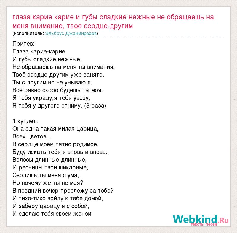 Припев: Глаза карие-карие, И губы сладкие,нежные. Не обращаешь на меня ты внимания, Твоё сердце другим уже занято. Ты с другим,но не унываю я, Всё равно скоро будешь ты моя. Я тебя украду,я тебя увезу, Я тебя у другого отниму. (3 раза) 1 куплет: Она одна такая милая царица, Всех цветов... В сердце моём пятно родимое, Буду искать тебя я вновь и вновь. Волосы длинные-длинные, И ресницы твои шикарные, Сводишь ты меня с ума, Но почему же ты не моя? В поздний вечер прослежу за тобой И тихо-тихо войду к тебе домой, И заберу царицу я с собой, И сделаю тебя своей женой.