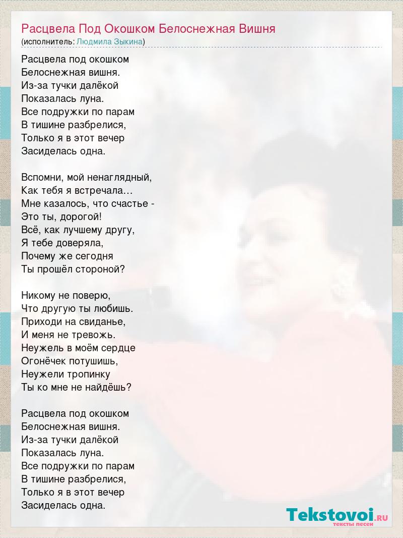Расцвела под окошком Белоснежная вишня. Из-за тучки далёкой Показалась луна. Все подружки по парам В тишине разбрелися, Только я в этот вечер Засиделась одна. Вспомни, мой ненаглядный, Как тебя я встречала… Мне казалось, что счастье - Это ты, дорогой! Всё, как лучшему другу, Я тебе доверяла, Почему же сегодня Ты прошёл стороной? Никому не поверю, Что другую ты любишь. Приходи на свиданье, И меня не тревожь. Неужель в моём сердце Огонёчек потушишь, Неужели тропинку Ты ко мне не найдёшь? Расцвела под окошком Белоснежная вишня. Из-за тучки далёкой Показалась луна. Все подружки по парам В тишине разбрелися, Только я в этот вечер Засиделась одна.
