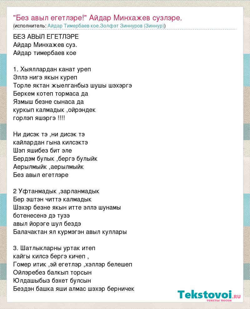 БЕЗ АВЫЛ ЕГЕТЛЭРЕ Айдар Минхажев суз. Айдар тимербаев кое 1. Хыяллардан канат уреп Эллэ нигэ якын куреп Торле яктан жыелганбыз шушы шэхэргэ Беркем котеп тормаса да Язмыш безне сынаса да куркып калмадык ,ойрэндек горлэп яшэргэ !!!! Ни дисэк тэ ,ни дисэк тэ кайлардан гына килсэктэ Шэп яшибез бит эле Бердэм булык ,бергэ булыйк Аерылмыйк ,аерылмыйк Без авыл егетлэре 2 Уфтанмадык ,зарланмадык Бер эштэн читтэ калмадык Шэхэр безне якын итте эллэ шунамы ботенесенэ дэ тузэ авыл йорэге шул бездэ Балачактан ял курмэгэн авыл куллары 3. Шатлыкларны уртак итеп кайгы килсэ бергэ кичеп , Гомер итик ,эй егетлэр ,хэллэр белешеп Ойлэребез балкып торсын Юлдашыбыз бэхет булсын Бездэн башка яши алмас шэхэр берничек