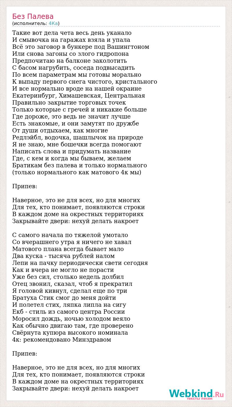 Такие вот дела чета весь день уканало И смывочка на гаражах взяла и упала Всё это заговор в бункере под Вашингтоном Или снова загоны со злого гидропона Предпочитаю на балконе заколотить С басом нагрубить, соседа подвысадить По всем параметрам мы готовы морально К выпаду первого снега чистого, кристального И все нормально вроде на нашей окраине Екатеринбург, Химашевская, Центральная Правильно закрытие торговых точек Только которые с гречей и никакие больше Где дороже, это ведь не значит лучше Есть знакомые, и они замутят по дружбе От души отдыхаем, как многие Редлэйбл, водочка, шашлычок на природе Я не знаю, мне бошечки всегда помогают Написать слова и придумать название Где, с кем и когда мы бываем, желаем Братикам без палева и только нормального (только нормального как матового 4к мы) Припев: Наверное, это не для всех, но для многих Для тех, кто понимает, появляются строки В каждом доме на окрестных территориях Закрывайте двери: нехуй делать накроет С самого начала по тяжелой умотало Со вчерашнего утра я ничего не хавал Матового плана всегда бывает мало Два куска - тысяча рублей налом Лепи на пачку периодически свети сегодня Как и вчера не могло не порасти Уже без сил, столько недель долбил Отец звонил, сказал, чтоб я прекратил Я головой кивнул, сделал еще по три Братуха Стик смог до меня дойти И полетел стих, ляпка липла на сигу Екб - стиль из самого центра России Моросил дождь, ночью холодом веяло Как обычно двигаю там, где проверено Свёрнута купюра высокого номинала 4к: рекомендовано Минздравом Припев: Наверное, это не для всех, но для многих Для тех, кто понимает, появляются строки В каждом доме на окрестных территориях Закрывайте двери: нехуй делать накроет
