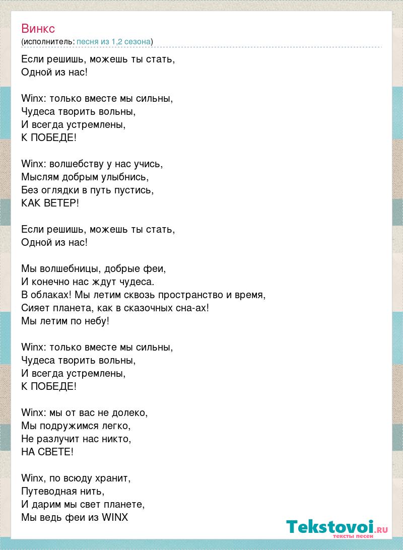 Если решишь, можешь ты стать, Одной из нас! Winx: только вместе мы сильны, Чудеса творить вольны, И всегда устремлены, К ПОБЕДЕ! Winx: волшебству у нас учись, Мыслям добрым улыбнись, Без оглядки в путь пустись, КАК ВЕТЕР! Если решишь, можешь ты стать, Одной из нас! Мы волшебницы, добрые феи, И конечно нас ждут чудеса. В облаках! Мы летим сквозь пространство и время, Сияет планета, как в сказочных сна-ах! Мы летим по небу! Winx: только вместе мы сильны, Чудеса творить вольны, И всегда устремлены, К ПОБЕДЕ! Winx: мы от вас не долеко, Мы подружимся легко, Не разлучит нас никто, НА СВЕТЕ! Winx, по всюду хранит, Путеводная нить, И дарим мы свет планете, Мы ведь феи из WINX