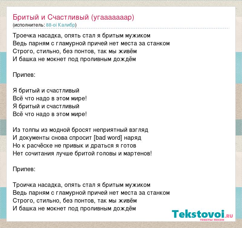 Троечка насадка, опять стал я бритым мужиком Ведь парням с гламурной причей нет места за станком Строго, стильно, без понтов, так мы живём И башка не мокнет под проливным дождём Припев: Я бритый и счастливый Всё что надо в этом мире! Я бритый и счастливый Всё что надо в этом мире! Из толпы из модной бросят неприятный взгляд И документы снова спросит [bad word] наряд Но к расчёске не привык и драться я готов Нет сочитания лучше бритой головы и мартенов! Припев: Троичка насадка, опять стал я бритым мужиком Ведь парням с гламурной причей нет места за станком Строго, стильно, без понтов, так мы живём И башка не мокнет под проливным дождём