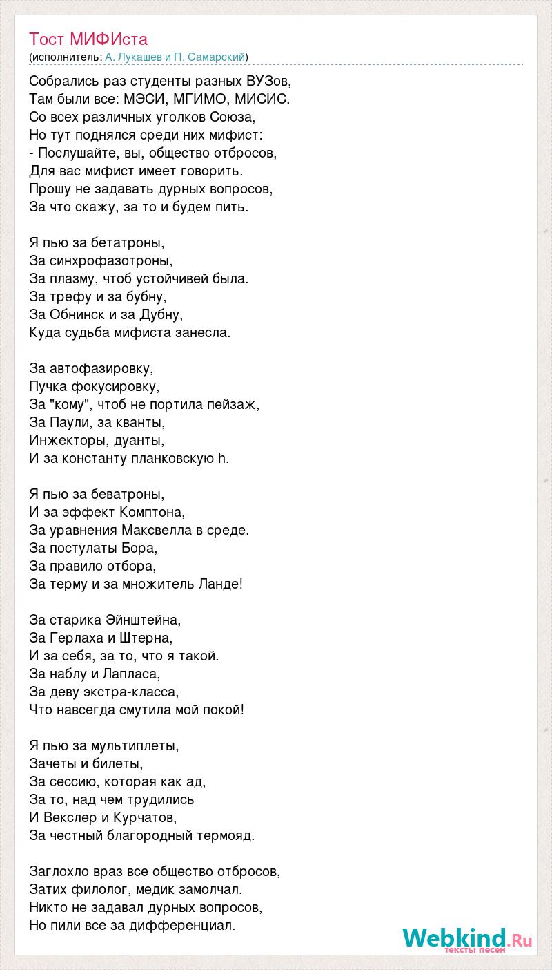 Собрались раз студенты разных ВУЗов, Там были все: МЭСИ, МГИМО, МИСИС. Со всех различных уголков Союза, Но тут поднялся среди них мифист: - Послушайте, вы, общество отбросов, Для вас мифист имеет говорить. Прошу не задавать дурных вопросов, За что скажу, за то и будем пить. Я пью за бетатроны, За синхрофазотроны, За плазму, чтоб устойчивей была. За трефу и за бубну, За Обнинск и за Дубну, Куда судьба мифиста занесла. За автофазировку, Пучка фокусировку, За "кому", чтоб не портила пейзаж, За Паули, за кванты, Инжекторы, дуанты, И за константу планковскую h. Я пью за беватроны, И за эффект Комптона, За уравнения Максвелла в среде. За постулаты Бора, За правило отбора, За терму и за множитель Ланде! За старика Эйнштейна, За Герлаха и Штерна, И за себя, за то, что я такой. За наблу и Лапласа, За деву экстра-класса, Что навсегда смутила мой покой! Я пью за мультиплеты, Зачеты и билеты, За сессию, которая как ад, За то, над чем трудились И Векслер и Курчатов, За честный благородный термояд. Заглохло враз все общество отбросов, Затих филолог, медик замолчал. Никто не задавал дурных вопросов, Но пили все за дифференциал.