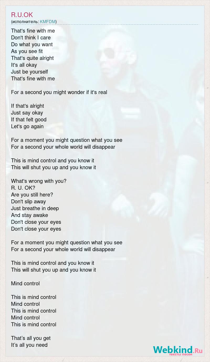 That's fine with me Don't think I care Do what you want As you see fit That's quite alright It's all okay Just be yourself That's fine with me For a second you might wonder if it's real If that's alright Just say okay If that felt good Let's go again For a moment you might question what you see For a second your whole world will disappear This is mind control and you know it This will shut you up and you know it What's wrong with you? R. U. OK? Are you still here? Don't slip away Just breathe in deep And stay awake Don't close your eyes Don't close your eyes For a moment you might question what you see For a second your whole world will disappear This is mind control and you know it This will shut you up and you know it Mind control This is mind control Mind control This is mind control Mind control This is mind control That’s all you get It’s all you need