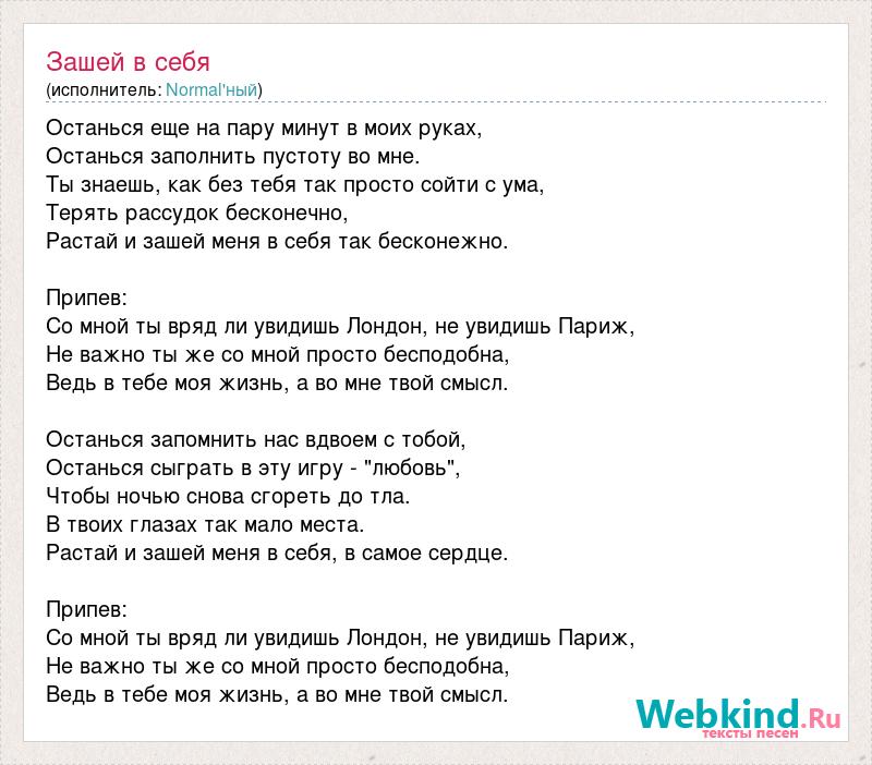 Останься еще на пару минут в моих руках, Останься заполнить пустоту во мне. Ты знаешь, как без тебя так просто сойти с ума, Терять рассудок бесконечно, Растай и зашей меня в себя так бесконежно. Припев: Со мной ты вряд ли увидишь Лондон, не увидишь Париж, Не важно ты же со мной просто бесподобна, Ведь в тебе моя жизнь, а во мне твой смысл. Останься запомнить нас вдвоем с тобой, Останься сыграть в эту игру - "любовь", Чтобы ночью снова сгореть до тла. В твоих глазах так мало места. Растай и зашей меня в себя, в самое сердце. Припев: Со мной ты вряд ли увидишь Лондон, не увидишь Париж, Не важно ты же со мной просто бесподобна, Ведь в тебе моя жизнь, а во мне твой смысл.