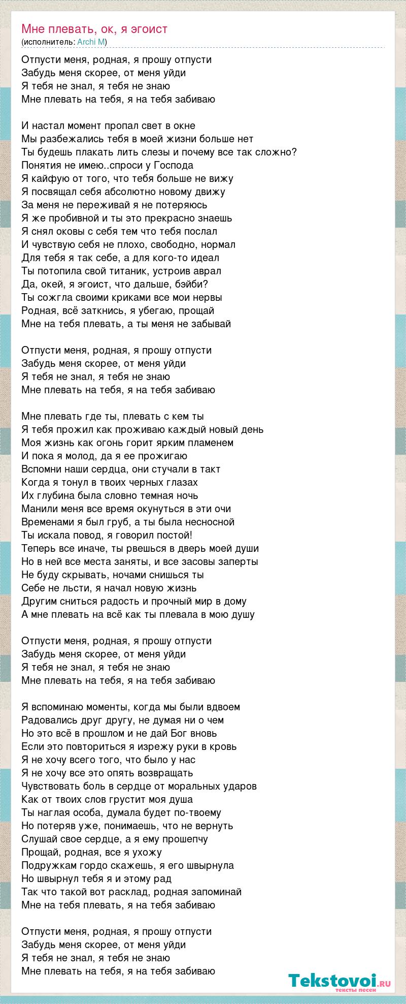 Отпусти меня, родная, я прошу отпусти Забудь меня скорее, от меня уйди Я тебя не знал, я тебя не знаю Мне плевать на тебя, я на тебя забиваю И настал момент пропал свет в окне Мы разбежались тебя в моей жизни больше нет Ты будешь плакать лить слезы и почему все так сложно? Понятия не имею..спроси у Господа Я кайфую от того, что тебя больше не вижу Я посвящал себя абсолютно новому движу За меня не переживай я не потеряюсь Я же пробивной и ты это прекрасно знаешь Я снял оковы с себя тем что тебя послал И чувствую себя не плохо, свободно, нормал Для тебя я так себе, а для кого-то идеал Ты потопила свой титаник, устроив аврал Да, окей, я эгоист, что дальше, бэйби? Ты сожгла своими криками все мои нервы Родная, всё заткнись, я убегаю, прощай Мне на тебя плевать, а ты меня не забывай Отпусти меня, родная, я прошу отпусти Забудь меня скорее, от меня уйди Я тебя не знал, я тебя не знаю Мне плевать на тебя, я на тебя забиваю Мне плевать где ты, плевать с кем ты Я тебя прожил как проживаю каждый новый день Моя жизнь как огонь горит ярким пламенем И пока я молод, да я ее прожигаю Вспомни наши сердца, они стучали в такт Когда я тонул в твоих черных глазах Их глубина была словно темная ночь Манили меня все время окунуться в эти очи Временами я был груб, а ты была несносной Ты искала повод, я говорил постой! Теперь все иначе, ты рвешься в дверь моей души Но в ней все места заняты, и все засовы заперты Не буду скрывать, ночами снишься ты Себе не льсти, я начал новую жизнь Другим сниться радость и прочный мир в дому А мне плевать на всё как ты плевала в мою душу Отпусти меня, родная, я прошу отпусти Забудь меня скорее, от меня уйди Я тебя не знал, я тебя не знаю Мне плевать на тебя, я на тебя забиваю Я вспоминаю моменты, когда мы были вдвоем Радовались друг другу, не думая ни о чем Но это всё в прошлом и не дай Бог вновь Если это повториться я изрежу руки в кровь Я не хочу всего того, что было у нас Я не хочу все это опять возвращать Чувствовать боль в сердце от моральных ударов Как от твоих слов грустит моя душа Ты наглая особа, думала будет по-твоему Но потеряв уже, понимаешь, что не вернуть Слушай свое сердце, а я ему прошепчу Прощай, родная, все я ухожу Подружкам гордо скажешь, я его швырнула Но швырнул тебя я и этому рад Так что такой вот расклад, родная запоминай Мне на тебя плевать, я на тебя забиваю Отпусти меня, родная, я прошу отпусти Забудь меня скорее, от меня уйди Я тебя не знал, я тебя не знаю Мне плевать на тебя, я на тебя забиваю