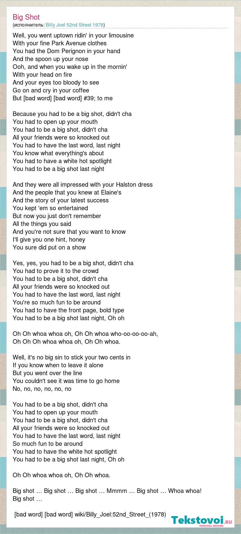 Well, you went uptown ridin' in your limousine With your fine Park Avenue clothes You had the Dom Perignon in your hand And the spoon up your nose Ooh, and when you wake up in the mornin' With your head on fire And your eyes too bloody to see Go on and cry in your coffee But [bad word] [bad word] #39; to me Because you had to be a big shot, didn't cha You had to open up your mouth You had to be a big shot, didn't cha All your friends were so knocked out You had to have the last word, last night You know what everything's about You had to have a white hot spotlight You had to be a big shot last night And they were all impressed with your Halston dress And the people that you knew at Elaine's And the story of your latest success You kept 'em so entertained But now you just don't remember All the things you said And you're not sure that you want to know I'll give you one hint, honey You sure did put on a show Yes, yes, you had to be a big shot, didn't cha You had to prove it to the crowd You had to be a big shot, didn't cha All your friends were so knocked out You had to have the last word, last night You're so much fun to be around You had to have the front page, bold type You had to be a big shot last night, Oh oh Oh Oh whoa whoa oh, Oh Oh whoa who-oo-oo-oo-ah, Oh Oh Oh whoa whoa oh, Oh Oh whoa. Well, it's no big sin to stick your two cents in If you know when to leave it alone But you went over the line You couldn't see it was time to go home No, no, no, no, no, no You had to be a big shot, didn't cha You had to open up your mouth You had to be a big shot, didn't cha All your friends were so knocked out You had to have the last word, last night So much fun to be around You had to have the white hot spotlight You had to be a big shot last night, Oh oh Oh Oh whoa whoa oh, Oh Oh whoa. Big shot … Big shot … Big shot … Mmmm … Big shot … Whoa whoa! Big shot … [bad word] [bad word] wiki/Billy_Joel:52nd_Street_(1978)