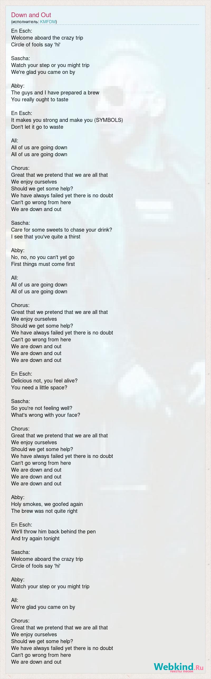 En Esch: Welcome aboard the crazy trip Circle of fools say 'hi' Sascha: Watch your step or you might trip We're glad you came on by Abby: The guys and I have prepared a brew You really ought to taste En Esch: It makes you strong and make you (SYMBOLS) Don't let it go to waste All: All of us are going down All of us are going down Chorus: Great that we pretend that we are all that We enjoy ourselves Should we get some help? We have always failed yet there is no doubt Can't go wrong from here We are down and out Sascha: Care for some sweets to chase your drink? I see that you've quite a thirst Abby: No, no, no you can't yet go First things must come first All: All of us are going down All of us are going down Chorus: Great that we pretend that we are all that We enjoy ourselves Should we get some help? We have always failed yet there is no doubt Can't go wrong from here We are down and out We are down and out We are down and out En Esch: Delicious not, you feel alive? You need a little space? Sascha: So you're not feeling well? What's wrong with your face? Chorus: Great that we pretend that we are all that We enjoy ourselves Should we get some help? We have always failed yet there is no doubt Can't go wrong from here We are down and out We are down and out We are down and out Abby: Holy smokes, we goofed again The brew was not quite right En Esch: We'll throw him back behind the pen And try again tonight Sascha: Welcome aboard the crazy trip Circle of fools say 'hi' Abby: Watch your step or you might trip All: We're glad you came on by Chorus: Great that we pretend that we are all that We enjoy ourselves Should we get some help? We have always failed yet there is no doubt Can't go wrong from here We are down and out