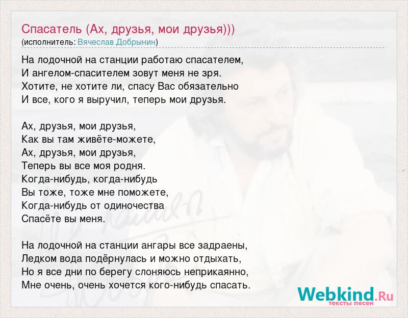 На лодочной на станции работаю спасателем, И ангелом-спасителем зовут меня не зря. Хотите, не хотите ли, спасу Вас обязательно И все, кого я выручил, теперь мои друзья. Ах, друзья, мои друзья, Как вы там живёте-можете, Ах, друзья, мои друзья, Теперь вы все моя родня. Когда-нибудь, когда-нибудь Вы тоже, тоже мне поможете, Когда-нибудь от одиночества Спасёте вы меня. На лодочной на станции ангары все задраены, Ледком вода подёрнулась и можно отдыхать, Но я все дни по берегу слоняюсь неприкаянно, Мне очень, очень хочется кого-нибудь спасать.
