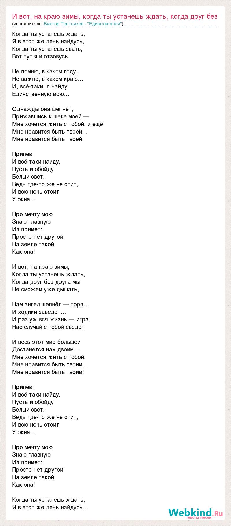 Когда ты устанешь ждать, Я в этот же день найдусь, Когда ты устанешь звать, Вот тут я и отзовусь. Не помню, в каком году, Не важно, в каком краю… И, всё-таки, я найду Единственную мою… Однажды она шепнёт, Прижавшись к щеке моей — Мне хочется жить с тобой, и ещё Мне нравится быть твоей… Мне нравится быть твоей! Припев: И всё-таки найду, Пусть и обойду Белый свет. Ведь где-то же не спит, И всю ночь стоит У окна… Про мечту мою Знаю главную Из примет: Просто нет другой На земле такой, Как она! И вот, на краю зимы, Когда ты устанешь ждать, Когда друг без друга мы Не сможем уже дышать, Нам ангел шепнёт — пора… И ходики заведёт… И раз уж вся жизнь — игра, Нас случай с тобой сведёт. И весь этот мир большой Достанется нам двоим… Мне хочется жить с тобой, Мне нравится быть твоим… Мне нравится быть твоим! Припев: И всё-таки найду, Пусть и обойду Белый свет. Ведь где-то же не спит, И всю ночь стоит У окна… Про мечту мою Знаю главную Из примет: Просто нет другой На земле такой, Как она! Когда ты устанешь ждать, Я в этот же день найдусь…