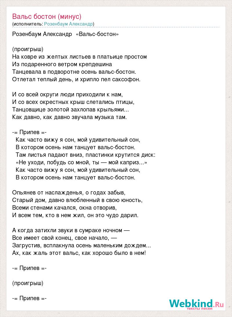 Розенбаум Александр «Вальс-бостон» (проигрыш) На ковре из желтых листьев в платьице простом Из подаренного ветром крепдешина Танцевала в подворотне осень вальс-бостон. Отлетал теплый день, и хрипло пел саксофон. И со всей округи люди приходили к нам, И со всех окрестных крыш слетались птицы, Танцовщице золотой захлопав крыльями... Как давно, как давно звучала музыка там. -= Припев =- Как часто вижу я сон, мой удивительный сон, В котором осень нам танцует вальс-бостон. Там листья падают вниз, пластинки крутится диск: «Не уходи, побудь со мной, ты — мой каприз...» Как часто вижу я сон, мой удивительный сон, В котором осень нам танцует вальс-бостон. Опьянев от наслажденья, о годах забыв, Старый дом, давно влюбленный в свою юность, Всеми стенами качался, окна отворив, И всем тем, кто в нем жил, он это чудо дарил. А когда затихли звуки в сумраке ночном — Все имеет свой конец, свое начало, — Загрустив, всплакнула осень маленьким дождем... Ах, как жаль этот вальс, как хорошо было в нем! -= Припев =- (проигрыш) -= Припев =-