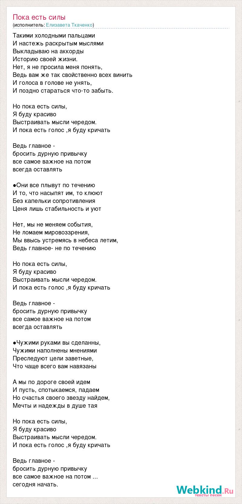 Такими холодными пальцами И настежь раскрытым мыслями Выкладываю на аккорды Историю своей жизни. Нет, я не просила меня понять, Ведь вам же так свойственно всех винить И голоса в голове не унять, И поздно стараться что-то забыть. Но пока есть силы, Я буду красиво Выстраивать мысли чередом. И пока есть голос ,я буду кричать Ведь главное - бросить дурную привычку все самое важное на потом всегда оставлять ●Они все плывут по течению И то, что насыпят им, то клюют Без капельки сопротивления Ценя лишь стабильность и уют Нет, мы не меняем события, Не ломаем мировоззрения, Мы ввысь устремясь в небеса летим, Ведь главное- не по течению Но пока есть силы, Я буду красиво Выстраивать мысли чередом. И пока есть голос ,я буду кричать Ведь главное - бросить дурную привычку все самое важное на потом всегда оставлять ●Чужими руками вы сделанны, Чужими наполнены мнениями Преследуют цели заветные, Что чаще всего вам навязаны А мы по дороге своей идем И пусть, спотыкаемся, падаем Но счастья своего звезду найдем, Мечты и надежды в душе тая Но пока есть силы, Я буду красиво Выстраивать мысли чередом. И пока есть голос ,я буду кричать Ведь главное - бросить дурную привычку все самое важное на потом ... сегодня начать.