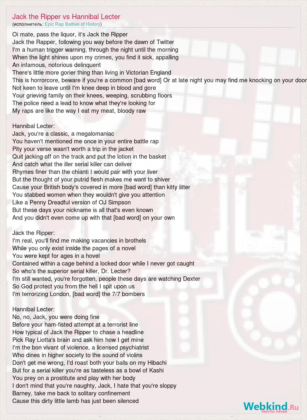 Oi mate, pass the liquor, it's Jack the Ripper Jack the Rapper, following you way before the dawn of Twitter I'm a human trigger warning, through the night until the morning When the light shines upon my crimes, you find it sick, appalling An infamous, notorious delinquent There's little more gorier thing than living in Victorian England This is horrorcore, beware if you're a common [bad word] Or at late night you may find me knocking on your door Not keen to leave until I'm knee deep in blood and gore Your grieving family on their knees, weeping, scrubbing floors The police need a lead to know what they're looking for My raps are like the way I eat my meat, bloody raw Hannibal Lecter: Jack, you're a classic, a megalomaniac You haven't mentioned me once in your entire battle rap Pity your verse wasn't worth a trip in the jacket Quit jacking off on the track and put the lotion in the basket And catch what the iller serial killer can deliver Rhymes finer than the chianti I would pair with your liver But the thought of your putrid flesh makes me want to shiver Cause your British body's covered in more [bad word] than kitty litter You stabbed women when they wouldn't give you attention Like a Penny Dreadful version of OJ Simpson But these days your nickname is all that's even known And you didn't even come up with that [bad word] on your own Jack the Ripper: I'm real, you'll find me making vacancies in brothels While you only exist inside the pages of a novel You were kept for ages in a hovel Contained within a cage behind a locked door while I never got caught So who's the superior serial killer, Dr. Lecter? I'm still wanted, you're forgotten, people these days are watching Dexter So God protect you from the hell I spit upon us I'm terrorizing London, [bad word] the 7/7 bombers Hannibal Lecter: No, no, Jack, you were doing fine Before your ham-fisted attempt at a terrorist line How typical of Jack the Ripper to chase a headline Pick Ray Liotta's brain and ask him how I get mine I'm the bon vivant of violence, a licensed psychiatrist Who dines in higher society to the sound of violins Don't get me wrong, I'd roast both your balls on my Hibachi But for a serial killer you're as tasteless as a bowl of Kashi You prey on a prostitute and play with her body I don't mind that you're naughty, Jack, I hate that you're sloppy Barney, take me back to solitary confinement Cause this dirty little lamb has just been silenced