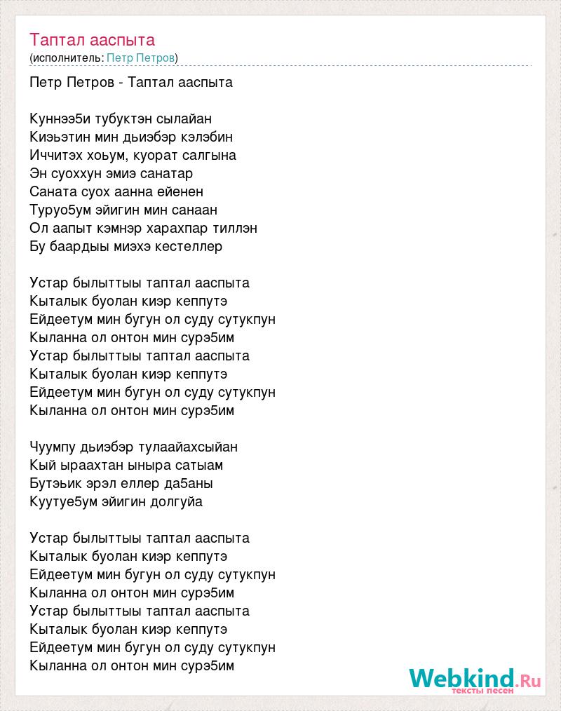 Петр Петров - Таптал ааспыта Куннээ5и тубуктэн сылайан Киэьэтин мин дьиэбэр кэлэбин Иччитэх хоьум, куорат салгына Эн суоххун эмиэ санатар Саната суох аанна ейенен Туруо5ум эйигин мин санаан Ол аапыт кэмнэр харахпар тиллэн Бу баардыы миэхэ кестеллер Устар былыттыы таптал ааспыта Кыталык буолан киэр кеппутэ Ейдеетум мин бугун ол суду сутукпун Кыланна ол онтон мин сурэ5им Устар былыттыы таптал ааспыта Кыталык буолан киэр кеппутэ Ейдеетум мин бугун ол суду сутукпун Кыланна ол онтон мин сурэ5им Чуумпу дьиэбэр тулаайахсыйан Кый ыраахтан ыныра сатыам Бутэьик эрэл еллер да5аны Куутуе5ум эйигин долгуйа Устар былыттыы таптал ааспыта Кыталык буолан киэр кеппутэ Ейдеетум мин бугун ол суду сутукпун Кыланна ол онтон мин сурэ5им Устар былыттыы таптал ааспыта Кыталык буолан киэр кеппутэ Ейдеетум мин бугун ол суду сутукпун Кыланна ол онтон мин сурэ5им