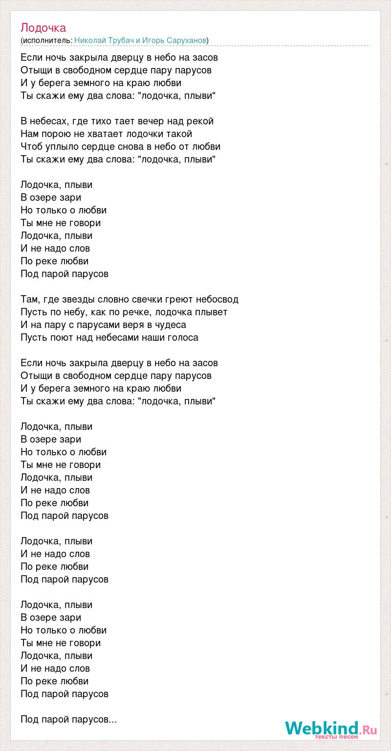 Если ночь закрыла дверцу в небо на засов Отыщи в свободном сердце пару парусов И у берега земного на краю любви Ты скажи ему два слова: "лодочка, плыви" В небесах, где тихо тает вечер над рекой Нам порою не хватает лодочки такой Чтоб уплыло сердце снова в небо от любви Ты скажи ему два слова: "лодочка, плыви" Лодочка, плыви В озере зари Но только о любви Ты мне не говори Лодочка, плыви И не надо слов По реке любви Под парой парусов Там, где звезды словно свечки греют небосвод Пусть по небу, как по речке, лодочка плывет И на пару с парусами веря в чудеса Пусть поют над небесами наши голоса Если ночь закрыла дверцу в небо на засов Отыщи в свободном сердце пару парусов И у берега земного на краю любви Ты скажи ему два слова: "лодочка, плыви" Лодочка, плыви В озере зари Но только о любви Ты мне не говори Лодочка, плыви И не надо слов По реке любви Под парой парусов Лодочка, плыви И не надо слов По реке любви Под парой парусов Лодочка, плыви В озере зари Но только о любви Ты мне не говори Лодочка, плыви И не надо слов По реке любви Под парой парусов Под парой парусов...
