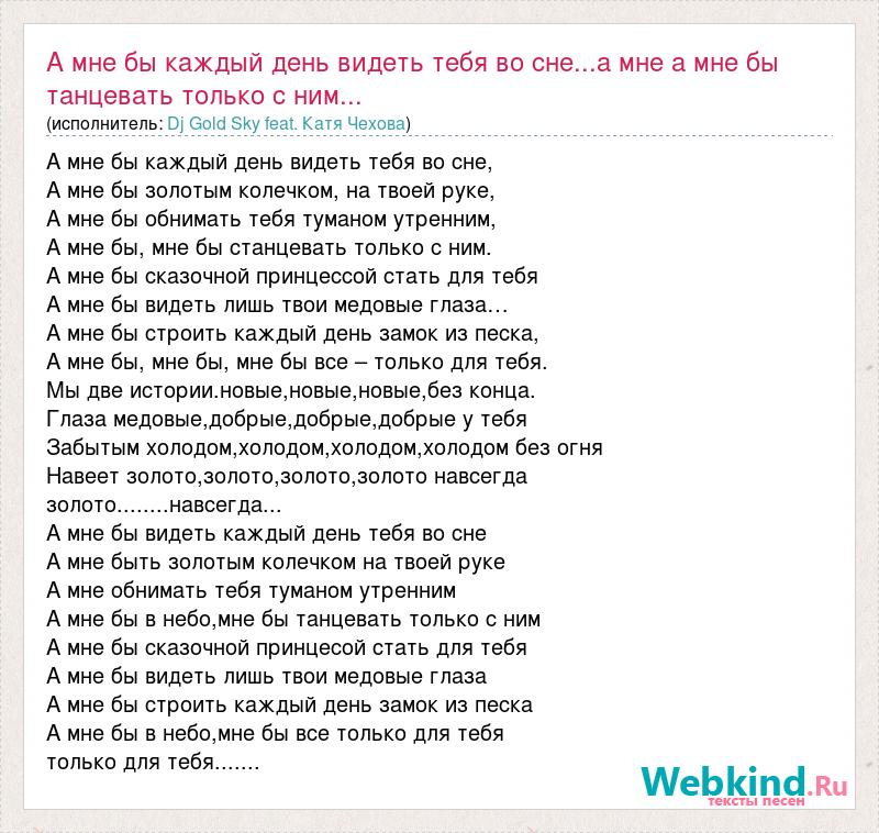 А мне бы каждый день видеть тебя во сне, А мне бы золотым колечком, на твоей руке, А мне бы обнимать тебя туманом утренним, А мне бы, мне бы станцевать только с ним. А мне бы сказочной принцессой стать для тебя А мне бы видеть лишь твои медовые глаза… А мне бы строить каждый день замок из песка, А мне бы, мне бы, мне бы все – только для тебя. Мы две истории.новые,новые,новые,без конца. Глаза медовые,добрые,добрые,добрые у тебя Забытым холодом,холодом,холодом,холодом без огня Навеет золото,золото,золото,золото навсегда золото........навсегда... А мне бы видеть каждый день тебя во сне А мне быть золотым колечком на твоей руке А мне обнимать тебя туманом утренним А мне бы в небо,мне бы танцевать только с ним А мне бы сказочной принцесой стать для тебя А мне бы видеть лишь твои медовые глаза А мне бы строить каждый день замок из песка А мне бы в небо,мне бы все только для тебя только для тебя.......