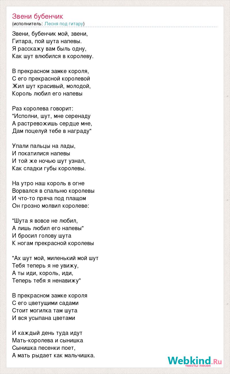 Звени, бубенчик мой, звени, Гитара, пой шута напевы. Я расскажу вам быль одну, Как шут влюбился в королеву. В прекрасном замке короля, С его прекрасной королевой Жил шут красивый, молодой, Король любил его напевы Раз королева говорит: "Исполни, шут, мне серенаду А растревожишь сердце мне, Дам поцелуй тебе в награду" Упали пальцы на лады, И покатилися напевы И той же ночью шут узнал, Как сладки губы королевы. На утро наш король в огне Ворвался в спальню королевы И что-то пряча под плащом Он грозно молвил королеве: "Шута я вовсе не любил, А лишь любил его напевы" И бросил голову шута К ногам прекрасной королевы "Ах шут мой, миленький мой шут Тебя теперь я не увижу, А ты иди, король, иди, Теперь тебя я ненавижу" В прекрасном замке короля С его цветущими садами Стоит могилка там шута И вся усыпана цветами И каждый день туда идут Мать-королева и сынишка Сынишка песенки поет, А мать рыдает как мальчишка.