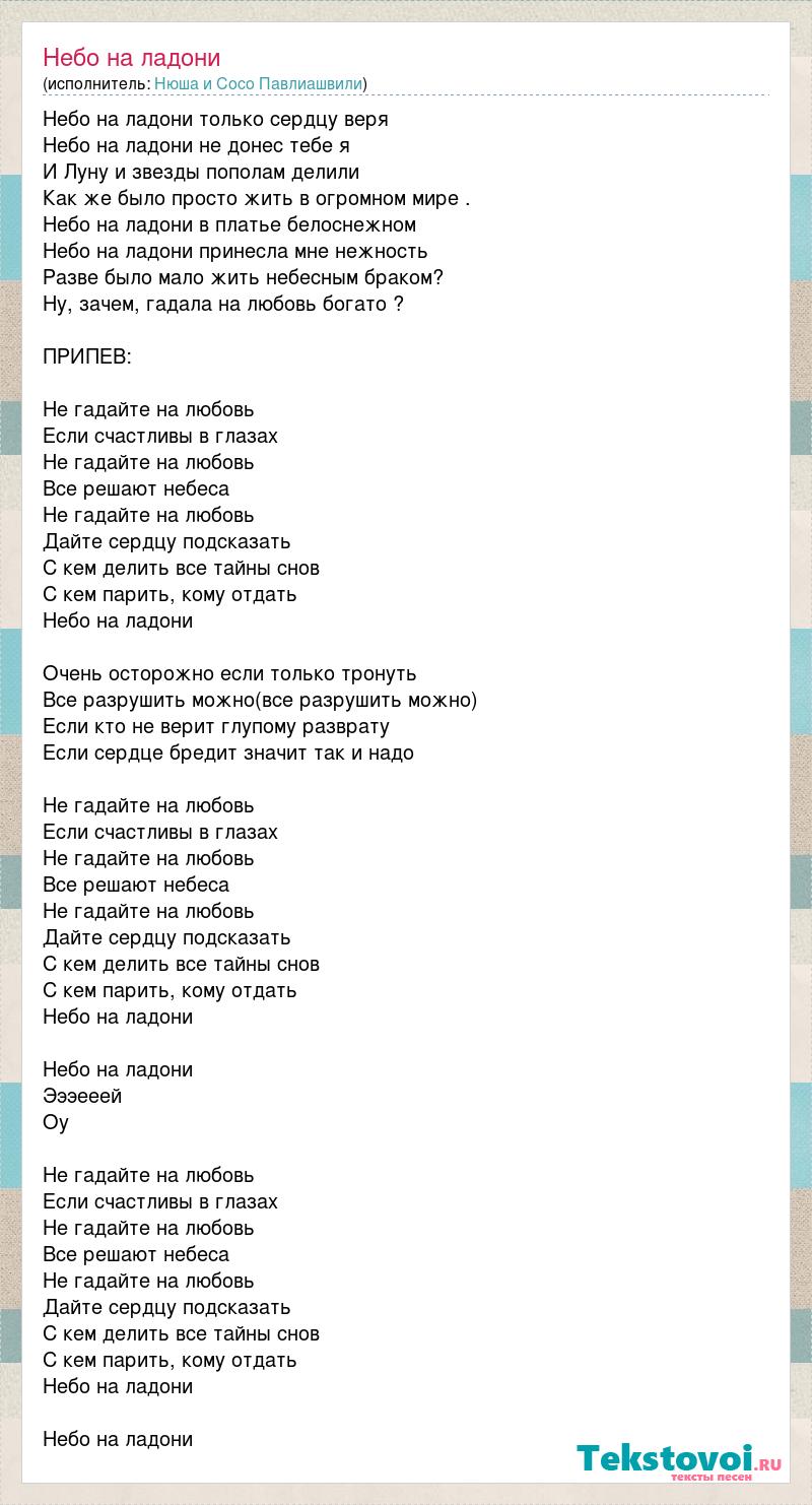 Небо на ладони только сердцу веря Небо на ладони не донес тебе я И Луну и звезды пополам делили Как же было просто жить в огромном мире . Небо на ладони в платье белоснежном Небо на ладони принесла мне нежность Разве было мало жить небесным браком? Ну, зачем, гадала на любовь богато ? ПРИПЕВ: Не гадайте на любовь Если счастливы в глазах Не гадайте на любовь Все решают небеса Не гадайте на любовь Дайте сердцу подсказать С кем делить все тайны снов С кем парить, кому отдать Небо на ладони Очень осторожно если только тронуть Все разрушить можно(все разрушить можно) Если кто не верит глупому разврату Если сердце бредит значит так и надо Не гадайте на любовь Если счастливы в глазах Не гадайте на любовь Все решают небеса Не гадайте на любовь Дайте сердцу подсказать С кем делить все тайны снов С кем парить, кому отдать Небо на ладони Небо на ладони Эээееей Оу Не гадайте на любовь Если счастливы в глазах Не гадайте на любовь Все решают небеса Не гадайте на любовь Дайте сердцу подсказать С кем делить все тайны снов С кем парить, кому отдать Небо на ладони Небо на ладони