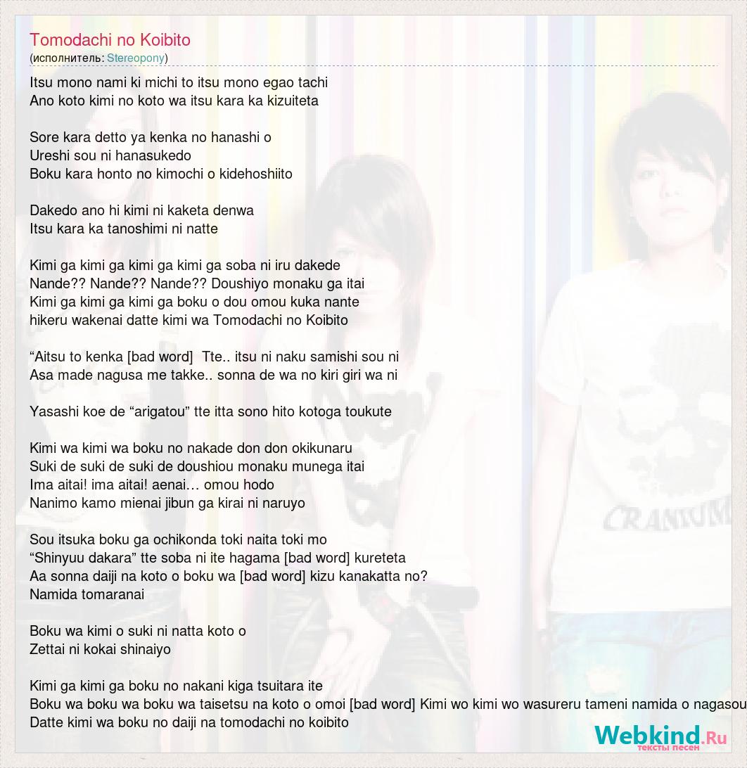 Itsu mono nami ki michi to itsu mono egao tachi Ano koto kimi no koto wa itsu kara ka kizuiteta Sore kara detto ya kenka no hanashi o Ureshi sou ni hanasukedo Boku kara honto no kimochi o kidehoshiito Dakedo ano hi kimi ni kaketa denwa Itsu kara ka tanoshimi ni natte Kimi ga kimi ga kimi ga kimi ga soba ni iru dakede Nande?? Nande?? Nande?? Doushiyo monaku ga itai Kimi ga kimi ga kimi ga boku o dou omou kuka nante hikeru wakenai datte kimi wa Tomodachi no Koibito “Aitsu to kenka [bad word] Tte.. itsu ni naku samishi sou ni Asa made nagusa me takke.. sonna de wa no kiri giri wa ni Yasashi koe de “arigatou” tte itta sono hito kotoga toukute Kimi wa kimi wa boku no nakade don don okikunaru Suki de suki de suki de doushiou monaku munega itai Ima aitai! ima aitai! aenai… omou hodo Nanimo kamo mienai jibun ga kirai ni naruyo Sou itsuka boku ga ochikonda toki naita toki mo “Shinyuu dakara” tte soba ni ite hagama [bad word] kureteta Aa sonna daiji na koto o boku wa [bad word] kizu kanakatta no? Namida tomaranai Boku wa kimi o suki ni natta koto o Zettai ni kokai shinaiyo Kimi ga kimi ga boku no nakani kiga tsuitara ite Boku wa boku wa boku wa taisetsu na koto o omoi [bad word] Kimi wo kimi wo wasureru tameni namida o nagasou Datte kimi wa boku no daiji na tomodachi no koibito