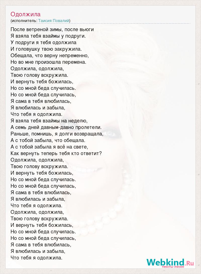 После ветреной зимы, после вьюги Я взяла тебя взаймы у подруги. У подруги я тебя одолжила И головушку твою закружила. Обещала, что верну непременно, Но во мне произошла перемена. Одолжила, одолжила, Твою голову вскружила. И вернуть тебя божилась, Но со мной беда случилась. Но со мной беда случилась, Я сама в тебя влюбилась, Я влюбилась и забыла, Что тебя я одолжила. Я взяла тебя взаймы на неделю, А семь дней давным-давно пролетели. Раньше, помнишь, я долги возвращала, А с тобой забыла, что обещала. А с тобой забыла я всё на свете, Как вернуть теперь тебя кто ответит? Одолжила, одолжила, Твою голову вскружила. И вернуть тебя божилась, Но со мной беда случилась. Но со мной беда случилась, Я сама в тебя влюбилась, Я влюбилась и забыла, Что тебя я одолжила. Одолжила, одолжила, Твою голову вскружила. И вернуть тебя божилась, Но со мной беда случилась. Но со мной беда случилась, Я сама в тебя влюбилась, Я влюбилась и забыла, Что тебя я одолжила.