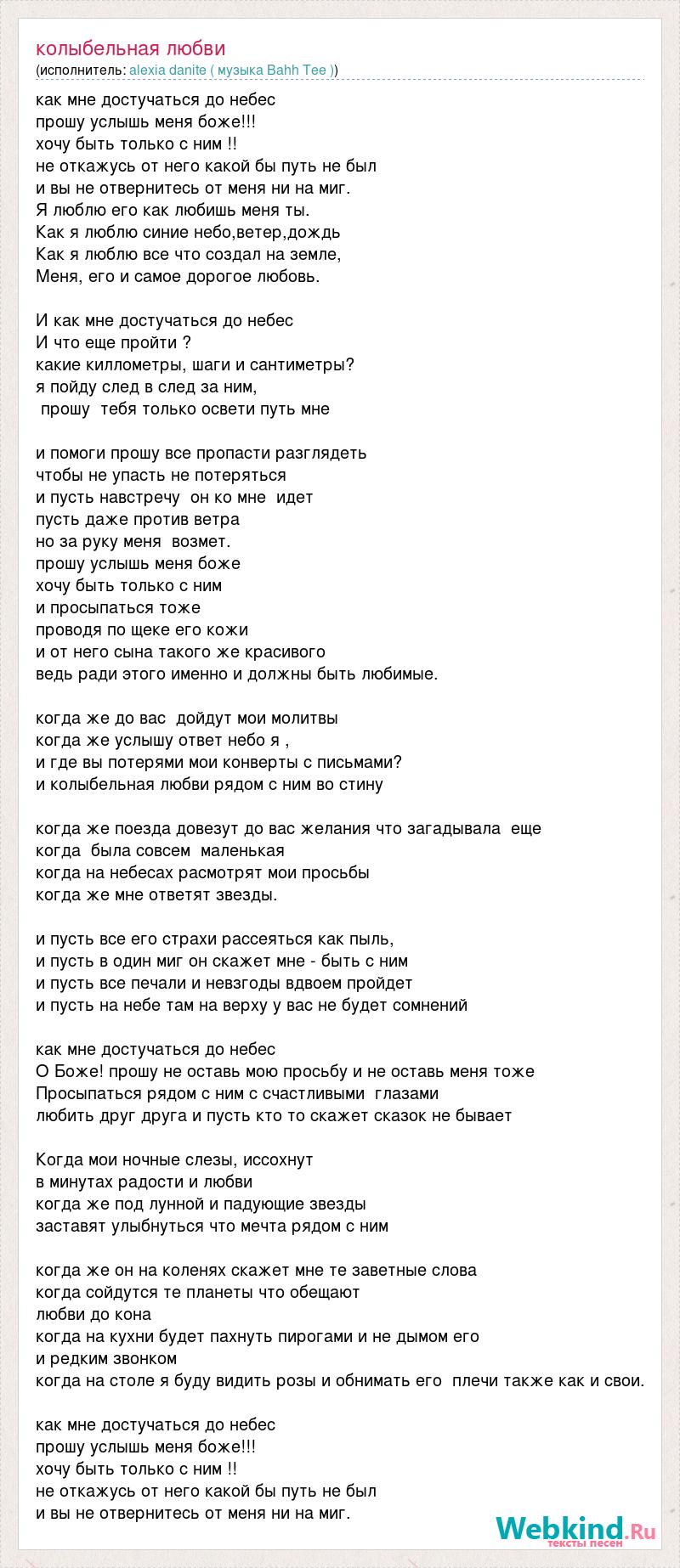 как мне достучаться до небес прошу услышь меня боже!!! хочу быть только с ним !! не откажусь от него какой бы путь не был и вы не отвернитесь от меня ни на миг. Я люблю его как любишь меня ты. Как я люблю синие небо,ветер,дождь Как я люблю все что создал на земле, Меня, его и самое дорогое любовь. И как мне достучаться до небес И что еще пройти ? какие киллометры, шаги и сантиметры? я пойду след в след за ним, прошу тебя только освети путь мне и помоги прошу все пропасти разглядеть чтобы не упасть не потеряться и пусть навстречу он ко мне идет пусть даже против ветра но за руку меня возмет. прошу услышь меня боже хочу быть только с ним и просыпаться тоже проводя по щеке его кожи и от него сына такого же красивого ведь ради этого именно и должны быть любимые. когда же до вас дойдут мои молитвы когда же услышу ответ небо я , и где вы потерями мои конверты с письмами? и колыбельная любви рядом с ним во стину когда же поезда довезут до вас желания что загадывала еще когда была совсем маленькая когда на небесах расмотрят мои просьбы когда же мне ответят звезды. и пусть все его страхи рассеяться как пыль, и пусть в один миг он скажет мне - быть с ним и пусть все печали и невзгоды вдвоем пройдет и пусть на небе там на верху у вас не будет сомнений как мне достучаться до небес О Боже! прошу не оставь мою просьбу и не оставь меня тоже Просыпаться рядом с ним с счастливыми глазами любить друг друга и пусть кто то скажет сказок не бывает Когда мои ночные слезы, иссохнут в минутах радости и любви когда же под лунной и падующие звезды заставят улыбнуться что мечта рядом с ним когда же он на коленях скажет мне те заветные слова когда сойдутся те планеты что обещают любви до кона когда на кухни будет пахнуть пирогами и не дымом его и редким звонком когда на столе я буду видить розы и обнимать его плечи также как и свои. как мне достучаться до небес прошу услышь меня боже!!! хочу быть только с ним !! не откажусь от него какой бы путь не был и вы не отвернитесь от меня ни на миг.
