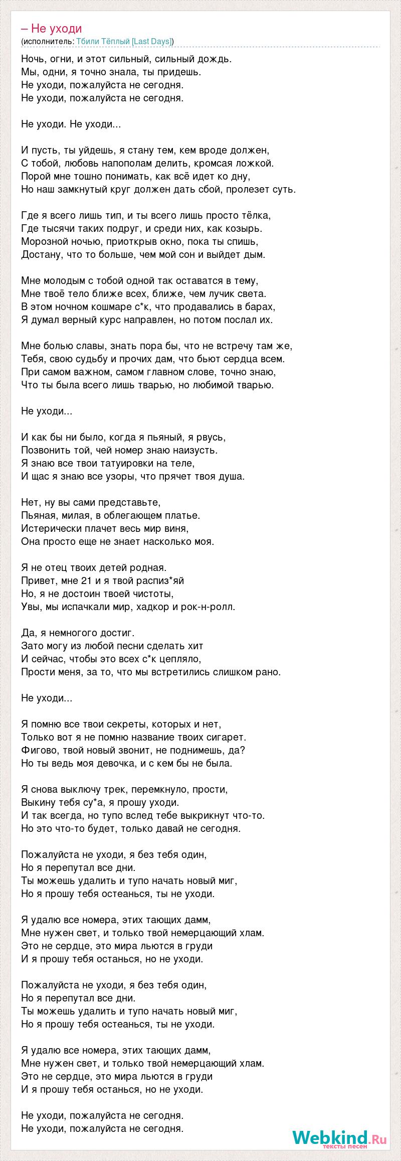 Ночь, огни, и этот сильный, сильный дождь. Мы, одни, я точно знала, ты придешь. Не уходи, пожалуйста не сегодня. Не уходи, пожалуйста не сегодня. Не уходи. Не уходи... И пусть, ты уйдешь, я стану тем, кем вроде должен, С тобой, любовь напополам делить, кромсая ложкой. Порой мне тошно понимать, как всё идет ко дну, Но наш замкнутый круг должен дать сбой, пролезет суть. Где я всего лишь тип, и ты всего лишь просто тёлка, Где тысячи таких подруг, и среди них, как козырь. Морозной ночью, приоткрыв окно, пока ты спишь, Достану, что то больше, чем мой сон и выйдет дым. Мне молодым с тобой одной так оставатся в тему, Мне твоё тело ближе всех, ближе, чем лучик света. В этом ночном кошмаре с*к, что продавались в барах, Я думал верный курс направлен, но потом послал их. Мне болью славы, знать пора бы, что не встречу там же, Тебя, свою судьбу и прочих дам, что бьют сердца всем. При самом важном, самом главном слове, точно знаю, Что ты была всего лишь тварью, но любимой тварью. Не уходи... И как бы ни было, когда я пьяный, я рвусь, Позвонить той, чей номер знаю наизусть. Я знаю все твои татуировки на теле, И щас я знаю все узоры, что прячет твоя душа. Нет, ну вы сами представьте, Пьяная, милая, в облегающем платье. Истерически плачет весь мир виня, Она просто еще не знает насколько моя. Я не отец твоих детей родная. Привет, мне 21 и я твой распиз*яй Но, я не достоин твоей чистоты, Увы, мы испачкали мир, хадкор и рок-н-ролл. Да, я немногого достиг. Зато могу из любой песни сделать хит И сейчас, чтобы это всех с*к цепляло, Прости меня, за то, что мы встретились слишком рано. Не уходи... Я помню все твои секреты, которых и нет, Только вот я не помню название твоих сигарет. Фигово, твой новый звонит, не поднимешь, да? Но ты ведь моя девочка, и с кем бы не была. Я снова выключу трек, перемкнуло, прости, Выкину тебя су*а, я прошу уходи. И так всегда, но тупо вслед тебе выкрикнут что-то. Но это что-то будет, только давай не сегодня. Пожалуйста не уходи, я без тебя один, Но я перепутал все дни. Ты можешь удалить и тупо начать новый миг, Но я прошу тебя остеанься, ты не уходи. Я удалю все номера, этих тающих дамм, Мне нужен свет, и только твой немерцающий хлам. Это не сердце, это мира льются в груди И я прошу тебя останься, но не уходи. Пожалуйста не уходи, я без тебя один, Но я перепутал все дни. Ты можешь удалить и тупо начать новый миг, Но я прошу тебя остеанься, ты не уходи. Я удалю все номера, этих тающих дамм, Мне нужен свет, и только твой немерцающий хлам. Это не сердце, это мира льются в груди И я прошу тебя останься, но не уходи. Не уходи, пожалуйста не сегодня. Не уходи, пожалуйста не сегодня.