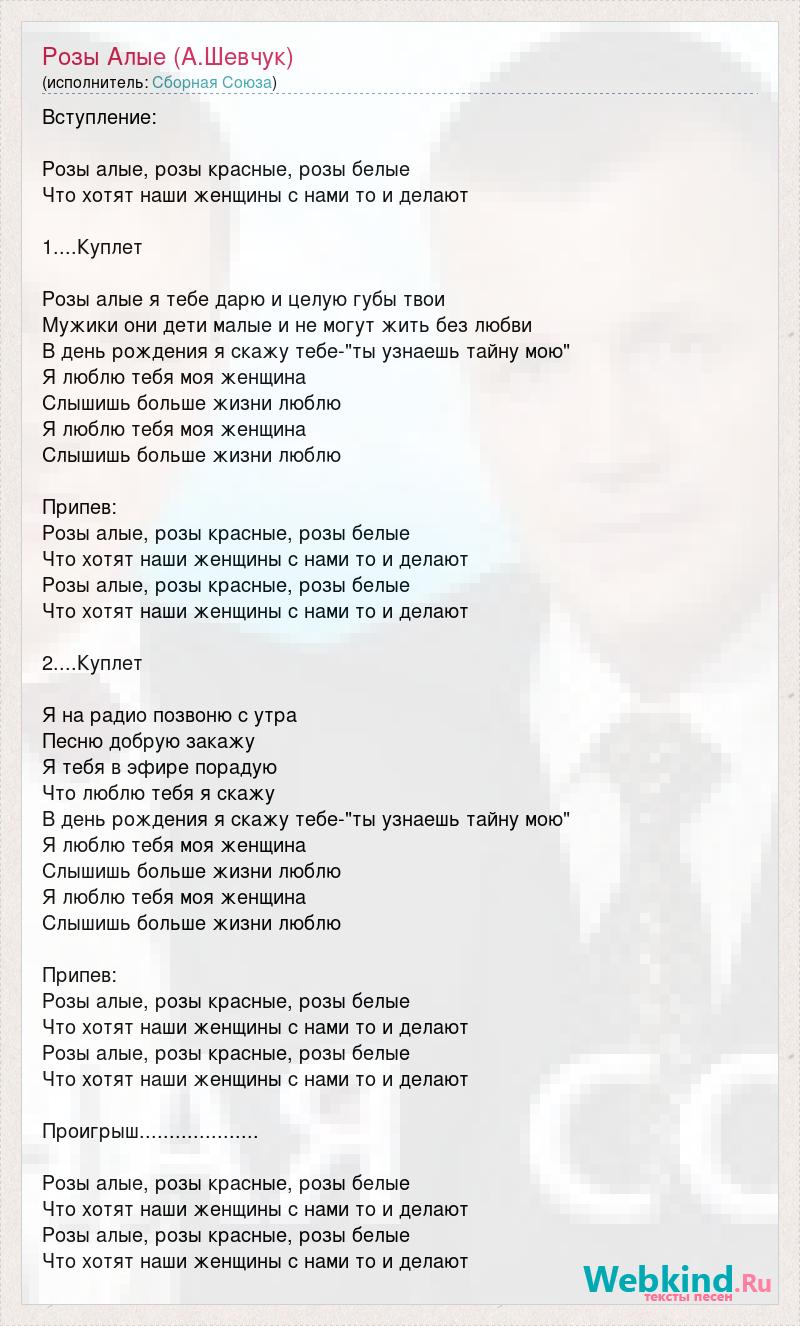 Вступление: Розы алые, розы красные, розы белые Что хотят наши женщины с нами то и делают 1....Куплет Розы алые я тебе дарю и целую губы твои Мужики они дети малые и не могут жить без любви В день рождения я скажу тебе-"ты узнаешь тайну мою" Я люблю тебя моя женщина Слышишь больше жизни люблю Я люблю тебя моя женщина Слышишь больше жизни люблю Припев: Розы алые, розы красные, розы белые Что хотят наши женщины с нами то и делают Розы алые, розы красные, розы белые Что хотят наши женщины с нами то и делают 2....Куплет Я на радио позвоню с утра Песню добрую закажу Я тебя в эфире порадую Что люблю тебя я скажу В день рождения я скажу тебе-"ты узнаешь тайну мою" Я люблю тебя моя женщина Слышишь больше жизни люблю Я люблю тебя моя женщина Слышишь больше жизни люблю Припев: Розы алые, розы красные, розы белые Что хотят наши женщины с нами то и делают Розы алые, розы красные, розы белые Что хотят наши женщины с нами то и делают Проигрыш.................... Розы алые, розы красные, розы белые Что хотят наши женщины с нами то и делают Розы алые, розы красные, розы белые Что хотят наши женщины с нами то и делают
