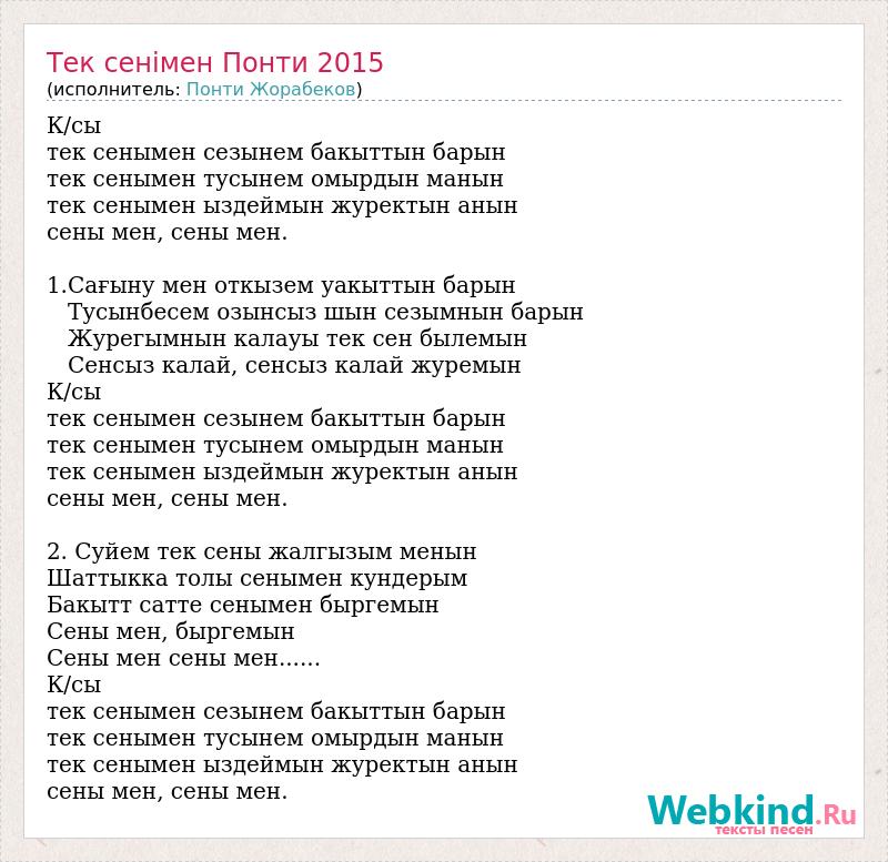 К/сы тек сенымен сезынем бакыттын барын тек сенымен тусынем омырдын манын тек сенымен ыздеймын журектын анын сены мен, сены мен. 1.Сағыну мен откызем уакыттын барын Тусынбесем озынсыз шын сезымнын барын Журегымнын калауы тек сен былемын Сенсыз калай, сенсыз калай журемын К/сы тек сенымен сезынем бакыттын барын тек сенымен тусынем омырдын манын тек сенымен ыздеймын журектын анын сены мен, сены мен. 2. Суйем тек сены жалгызым менын Шаттыкка толы сенымен кундерым Бакытт сатте сенымен быргемын Сены мен, быргемын Сены мен сены мен...... К/сы тек сенымен сезынем бакыттын барын тек сенымен тусынем омырдын манын тек сенымен ыздеймын журектын анын сены мен, сены мен.