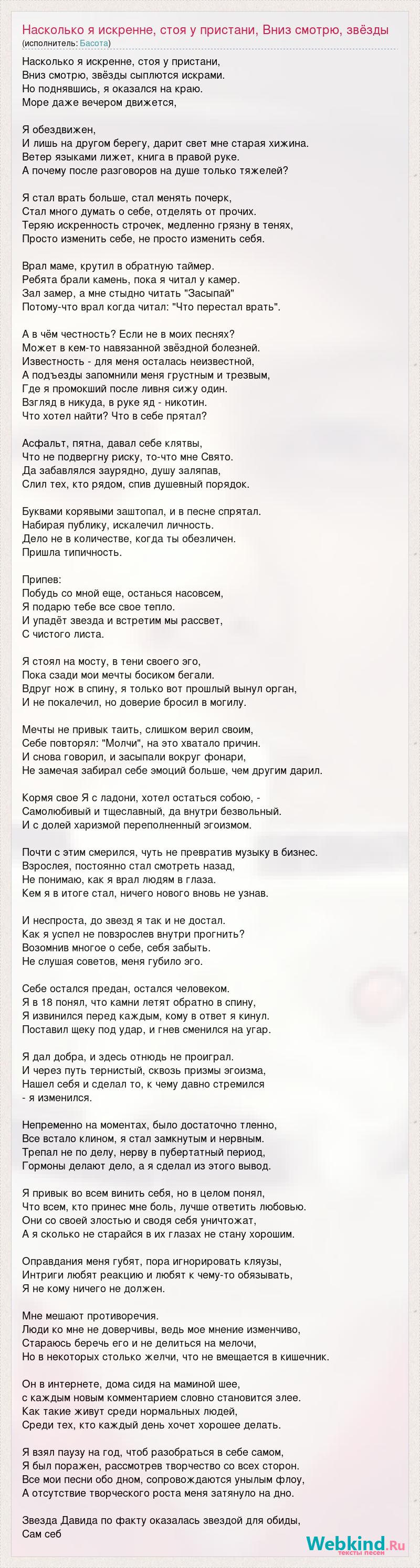 Главная→Исполнители→Басота→Насколько я искренне, стоя у пристани, Вниз смотрю, звёзды сыплются искрами. Н