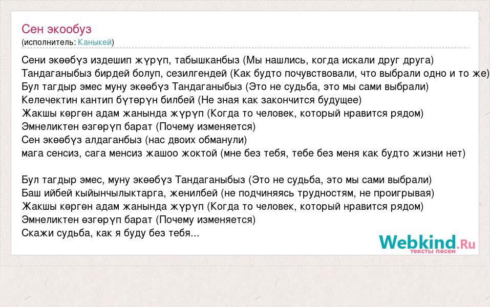 Сени экөөбүз издешип жүрүп, табышканбыз (Мы нашлись, когда искали друг друга) Тандаганыбыз бирдей болуп, сезилгендей (Как будто почувствовали, что выбрали одно и то же) Бул тагдыр эмес муну экөөбүз Тандаганыбыз (Это не судьба, это мы сами выбрали) Келечектин кантип бүтөрүн билбей (Не зная как закончится будущее) Жакшы көргөн адам жанында жүрүп (Когда то человек, который нравится рядом) Эмнеликтен өзгөрүп барат (Почему изменяется) Сен экөөбүз алдаганбыз (нас двоих обманули) мага сенсиз, сага менсиз жашоо жоктой (мне без тебя, тебе без меня как будто жизни нет) Бул тагдыр эмес, муну экөөбүз Тандаганыбыз (Это не судьба, это мы сами выбрали) Баш ийбей кыйынчылыктарга, женилбей (не подчиняясь трудностям, не проигрывая) Жакшы көргөн адам жанында жүрүп (Когда то человек, который нравится рядом) Эмнеликтен өзгөрүп барат (Почему изменяется) Скажи судьба, как я буду без тебя...