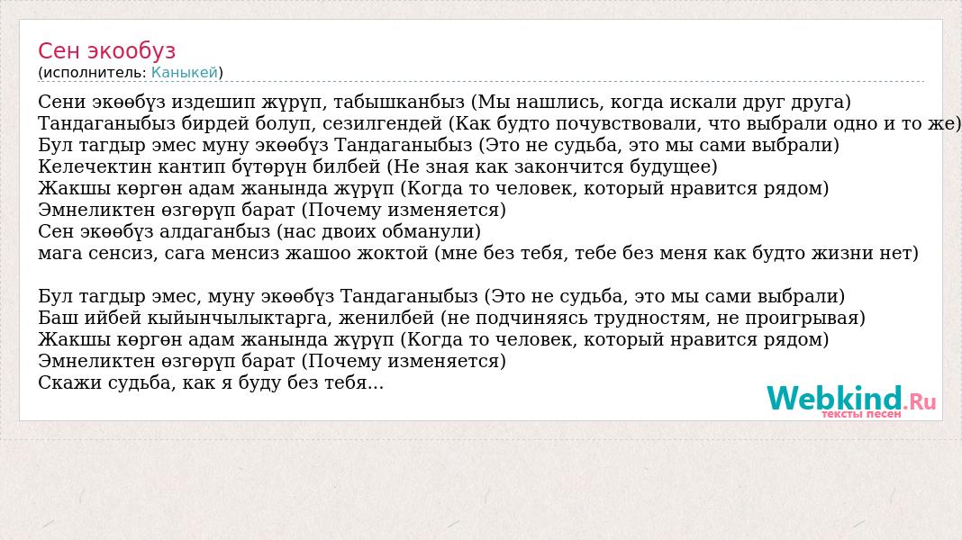 Сени экөөбүз издешип жүрүп, табышканбыз (Мы нашлись, когда искали друг друга) Тандаганыбыз бирдей болуп, сезилгендей (Как будто почувствовали, что выбрали одно и то же) Бул тагдыр эмес муну экөөбүз Тандаганыбыз (Это не судьба, это мы сами выбрали) Келечектин кантип бүтөрүн билбей (Не зная как закончится будущее) Жакшы көргөн адам жанында жүрүп (Когда то человек, который нравится рядом) Эмнеликтен өзгөрүп барат (Почему изменяется) Сен экөөбүз алдаганбыз (нас двоих обманули) мага сенсиз, сага менсиз жашоо жоктой (мне без тебя, тебе без меня как будто жизни нет) Бул тагдыр эмес, муну экөөбүз Тандаганыбыз (Это не судьба, это мы сами выбрали) Баш ийбей кыйынчылыктарга, женилбей (не подчиняясь трудностям, не проигрывая) Жакшы көргөн адам жанында жүрүп (Когда то человек, который нравится рядом) Эмнеликтен өзгөрүп барат (Почему изменяется) Скажи судьба, как я буду без тебя...
