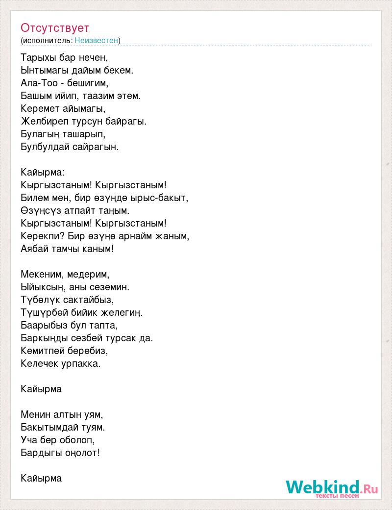 Тарыхы бар нечен, Ынтымагы дайым бекем. Ала-Тоо - бешигим, Башым ийип, таазим этем. Керемет айымагы, Желбиреп турсун байрагы. Булагың ташарып, Булбулдай сайрагын. Кайырма: Кыргызстаным! Кыргызстаным! Билем мен, бир өзүңдө ырыс-бакыт, Өзүңсүз атпайт таңым. Кыргызстаным! Кыргызстаным! Керекпи? Бир өзүңө арнайм жаным, Аябай тамчы каным! Мекеним, медерим, Ыйыксың, аны сеземин. Түбөлүк сактайбыз, Түшүрбөй бийик желегиң. Баарыбыз бул тапта, Баркыңды сезбей турсак да. Кемитпей беребиз, Келечек урпакка. Кайырма Менин алтын уям, Бакытымдай туям. Уча бер оболоп, Бардыгы оңолот! Кайырма