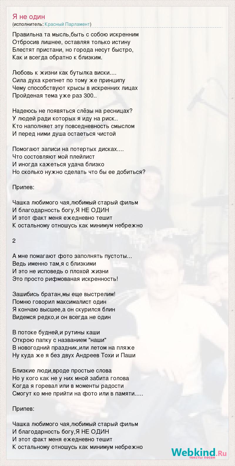 Правильна та мысль,быть с собою искренним Отбросив лишнее, оставляя только истину Блестят пристани, но города несут быстро, Как и всегда обратно к близким. Любовь к жизни как бутылка виски.... Сила духа крепнет по тому же принципу Чему способствуют крысы в искренних лицах Пройденая тема уже раз 300.. Надеюсь не появяться слёзы на ресницах? У людей ради которых я иду на риск.. Кто наполняет эту повседневность смыслом И перед ними душа остаеться чистой Помогают записи на потертых дисках.... Что состовляют мой плейлист И иногда кажеться удача близко Но сколько нужно сделать что бы ее добиться? Припев: Чашка любимого чая,любимый старый фильм И благодарность богу,Я НЕ ОДИН И этот факт меня ежедневно тешит К остальному отношусь как минимум небрежно 2 А мне помагают фото заполнять пустоты... Ведь именно там,я с близкими И это не исповедь о плохой жизни Это просто рифмованая искренность! Зашибись братан,мы еще выстрелим! Помню говорил максималист один Я кончаю высшее,а он скурился блин Видемся редко,и он всегда не один В потоке будней,и рутины каши Открою папку с названием "наши" В новогодний праздник,или летом на пляже Ну куда же я без двух Андреев Тохи и Паши Близкие люди,вроде простые слова Но у кого как не у них мной забита голова Когда я горевал или в моменты радости Смогут ко мне прийти на фото или в памяти..... Припев: Чашка любимого чая,любимый старый фильм И благодарность богу,Я НЕ ОДИН И этот факт меня ежедневно тешит К остальному отношусь как минимум небрежно