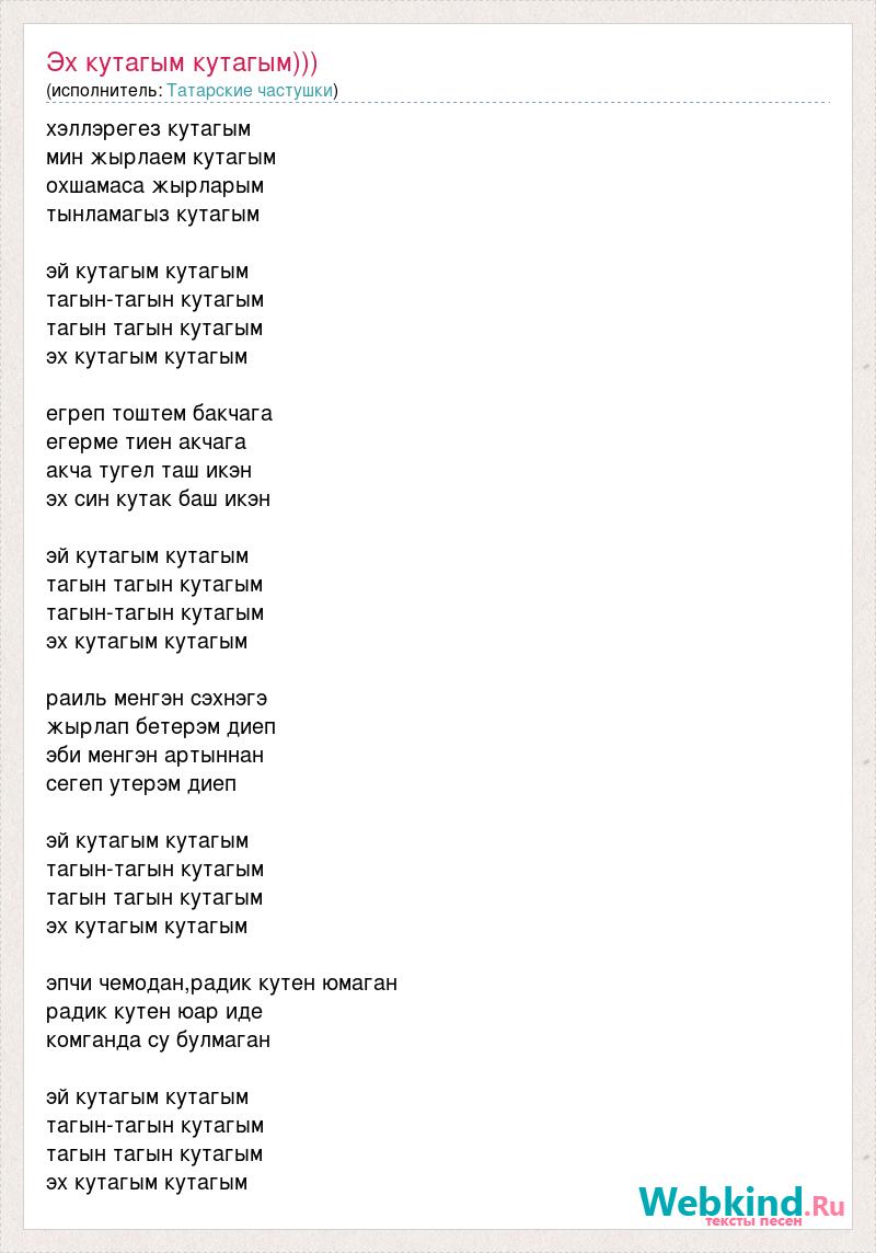 хэллэрегез кутагым мин жырлаем кутагым охшамаса жырларым тынламагыз кутагым эй кутагым кутагым тагын-тагын кутагым тагын тагын кутагым эх кутагым кутагым егреп тоштем бакчага егерме тиен акчага акча тугел таш икэн эх син кутак баш икэн эй кутагым кутагым тагын тагын кутагым тагын-тагын кутагым эх кутагым кутагым раиль менгэн сэхнэгэ жырлап бетерэм диеп эби менгэн артыннан сегеп утерэм диеп эй кутагым кутагым тагын-тагын кутагым тагын тагын кутагым эх кутагым кутагым эпчи чемодан,радик кутен юмаган радик кутен юар иде комганда су булмаган эй кутагым кутагым тагын-тагын кутагым тагын тагын кутагым эх кутагым кутагым