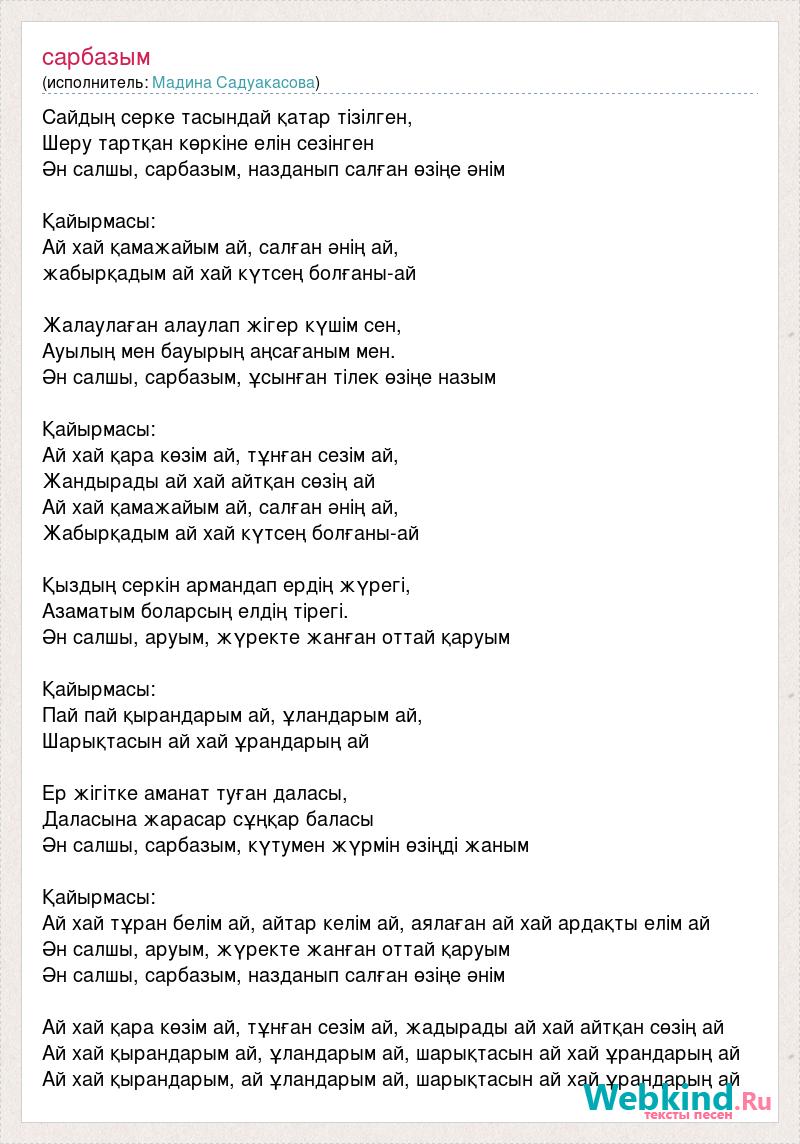 Сайдың серке тасындай қатар тізілген, Шеру тартқан көркіне елін сезінген Ән салшы, сарбазым, назданып салған өзіңе әнім Қайырмасы: Ай хай қамажайым ай, салған әнің ай, жабырқадым ай хай күтсең болғаны-ай Жалаулаған алаулап жігер күшім сен, Ауылың мен бауырың аңсағаным мен. Ән салшы, сарбазым, ұсынған тілек өзіңе назым Қайырмасы: Ай хай қара көзім ай, тұнған сезім ай, Жандырады ай хай айтқан сөзің ай Ай хай қамажайым ай, салған әнің ай, Жабырқадым ай хай күтсең болғаны-ай Қыздың серкін армандап ердің жүрегі, Азаматым боларсың елдің тірегі. Ән салшы, аруым, жүректе жанған оттай қаруым Қайырмасы: Пай пай қырандарым ай, ұландарым ай, Шарықтасын ай хай ұрандарың ай Ер жігітке аманат туған даласы, Даласына жарасар сұңқар баласы Ән салшы, сарбазым, күтумен жүрмін өзіңді жаным Қайырмасы: Ай хай тұран белім ай, айтар келім ай, аялаған ай хай ардақты елім ай Ән салшы, аруым, жүректе жанған оттай қаруым Ән салшы, сарбазым, назданып салған өзіңе әнім Ай хай қара көзім ай, тұнған сезім ай, жадырады ай хай айтқан сөзің ай Ай хай қырандарым ай, ұландарым ай, шарықтасын ай хай ұрандарың ай Ай хай қырандарым, ай ұландарым ай, шарықтасын ай хай ұрандарың ай