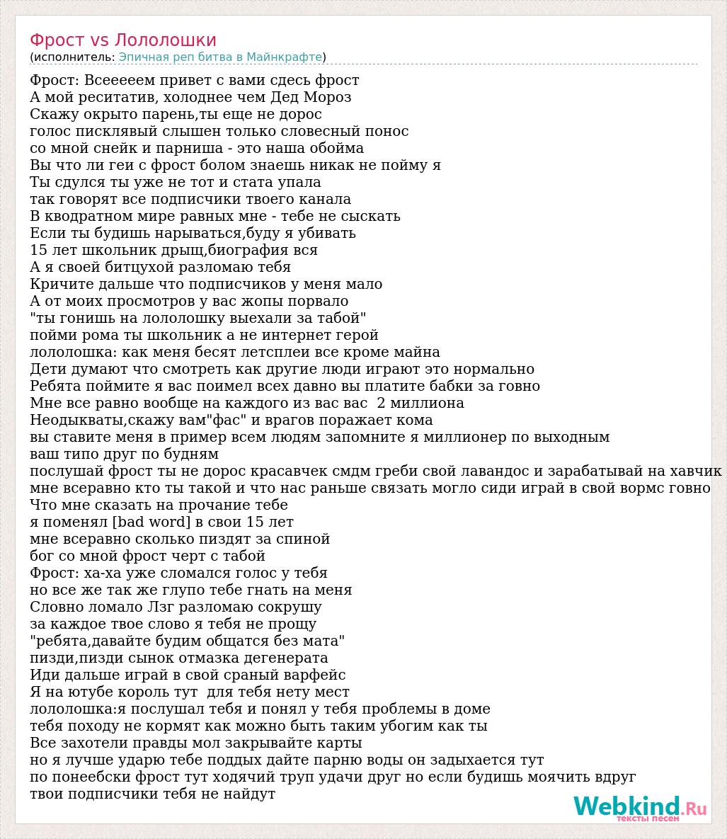 Фрост: Всееееем привет с вами сдесь фрост А мой реситатив, холоднее чем Дед Мороз Скажу окрыто парень,ты еще не дорос голос писклявый слышен только словесный понос со мной снейк и парниша - это наша обойма Вы что ли геи с фрост болом знаешь никак не пойму я Ты сдулся ты уже не тот и стата упала так говорят все подписчики твоего канала В кводратном мире равных мне - тебе не сыскать Если ты будишь нарываться,буду я убивать 15 лет школьник дрыщ,биография вся А я своей битцухой разломаю тебя Кричите дальше что подписчиков у меня мало А от моих просмотров у вас жопы порвало "ты гонишь на лололошку выехали за табой" пойми рома ты школьник а не интернет герой лололошка: как меня бесят летсплеи все кроме майна Дети думают что смотреть как другие люди играют это нормально Ребята поймите я вас поимел всех давно вы платите бабки за говно Мне все равно вообще на каждого из вас вас 2 миллиона Неодыкваты,скажу вам"фас" и врагов поражает кома вы ставите меня в пример всем людям запомните я миллионер по выходным ваш типо друг по будням послушай фрост ты не дорос красавчек смдм греби свой лавандос и зарабатывай на хавчик мне всеравно кто ты такой и что нас раньше связать могло сиди играй в свой вормс говно Что мне сказать на прочание тебе я поменял [bad word] в свои 15 лет мне всеравно сколько пиздят за спиной бог со мной фрост черт с табой Фрост: ха-ха уже сломался голос у тебя но все же так же глупо тебе гнать на меня Словно ломало Лзг разломаю сокрушу за каждое твое слово я тебя не прощу "ребята,давайте будим общатся без мата" пизди,пизди сынок отмазка дегенерата Иди дальше играй в свой сраный варфейс Я на ютубе король тут для тебя нету мест лололошка:я послушал тебя и понял у тебя проблемы в доме тебя походу не кормят как можно быть таким убогим как ты Все захотели правды мол закрывайте карты но я лучше ударю тебе поддых дайте парню воды он задыхается тут по понеебски фрост тут ходячий труп удачи друг но если будишь моячить вдруг твои подписчики тебя не найдут