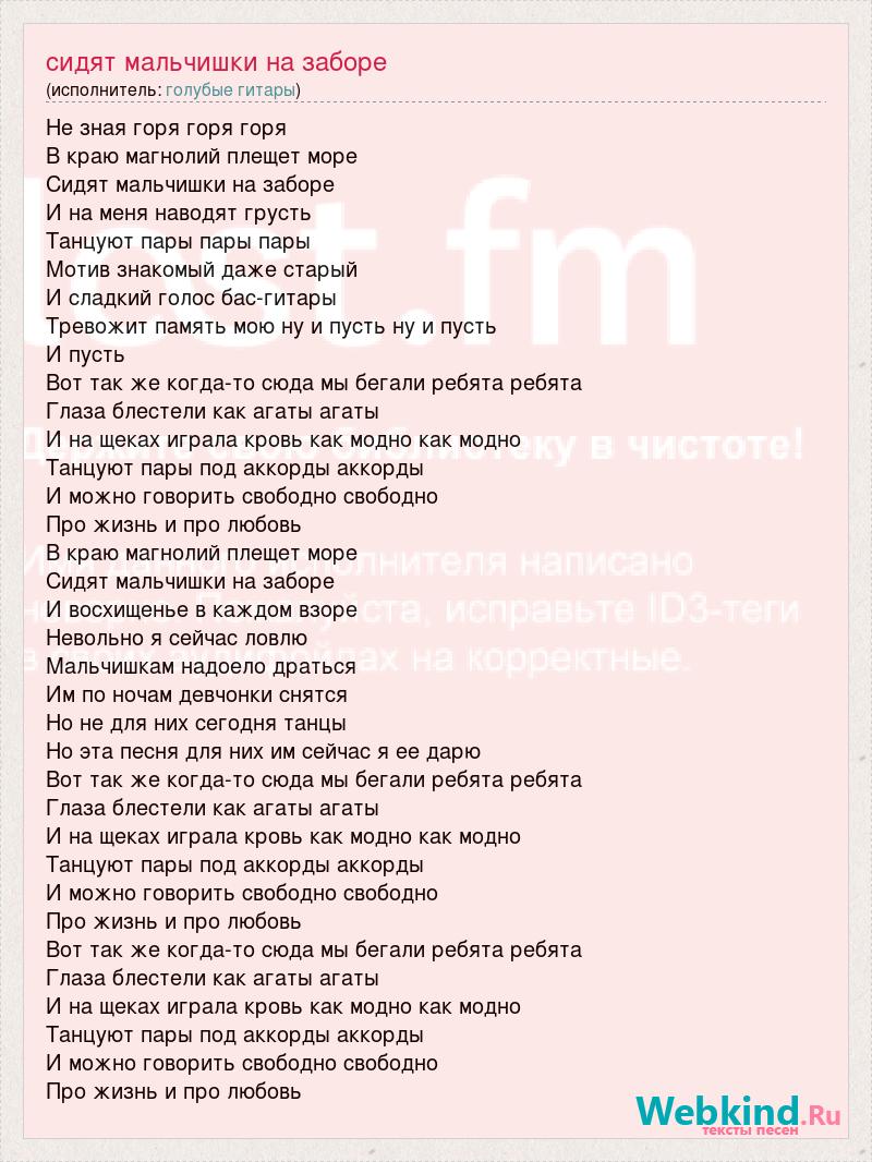 Не зная горя горя горя В краю магнолий плещет море Сидят мальчишки на заборе И на меня наводят грусть Танцуют пары пары пары Мотив знакомый даже старый И сладкий голос бас-гитары Тревожит память мою ну и пусть ну и пусть И пусть Вот так же когда-то сюда мы бегали ребята ребята Глаза блестели как агаты агаты И на щеках играла кровь как модно как модно Танцуют пары под аккорды аккорды И можно говорить свободно свободно Про жизнь и про любовь В краю магнолий плещет море Сидят мальчишки на заборе И восхищенье в каждом взоре Невольно я сейчас ловлю Мальчишкам надоело драться Им по ночам девчонки снятся Но не для них сегодня танцы Но эта песня для них им сейчас я ее дарю Вот так же когда-то сюда мы бегали ребята ребята Глаза блестели как агаты агаты И на щеках играла кровь как модно как модно Танцуют пары под аккорды аккорды И можно говорить свободно свободно Про жизнь и про любовь Вот так же когда-то сюда мы бегали ребята ребята Глаза блестели как агаты агаты И на щеках играла кровь как модно как модно Танцуют пары под аккорды аккорды И можно говорить свободно свободно Про жизнь и про любовь