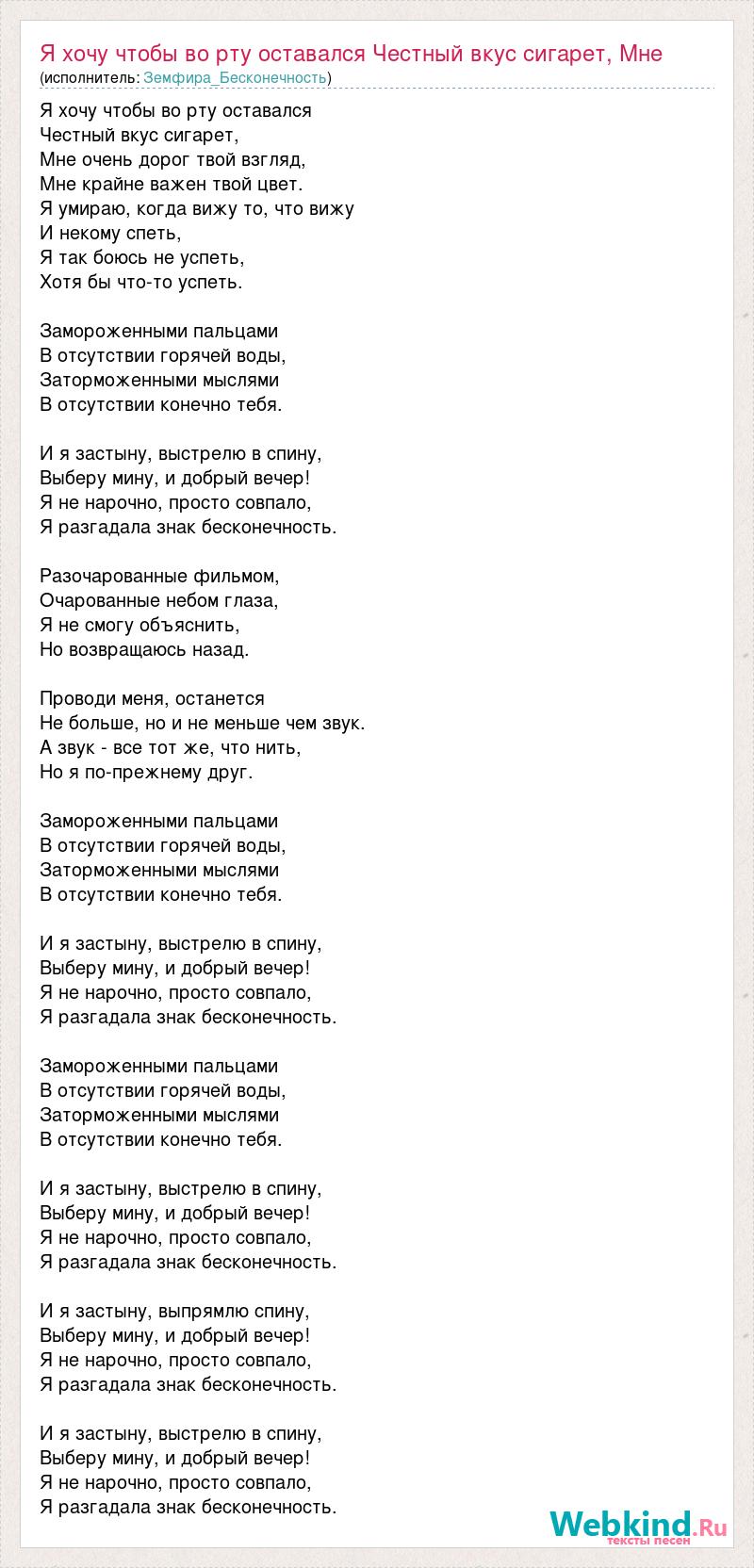 Я хочу чтобы во рту оставался Честный вкус сигарет, Мне очень дорог твой взгляд, Мне крайне важен твой цвет. Я умираю, когда вижу то, что вижу И некому спеть, Я так боюсь не успеть, Хотя бы что-то успеть. Замороженными пальцами В отсутствии горячей воды, Заторможенными мыслями В отсутствии конечно тебя. И я застыну, выстрелю в спину, Выберу мину, и добрый вечер! Я не нарочно, просто совпало, Я разгадала знак бесконечность. Разочарованные фильмом, Очарованные небом глаза, Я не смогу объяснить, Но возвращаюсь назад. Проводи меня, останется Не больше, но и не меньше чем звук. А звук - все тот же, что нить, Но я по-прежнему друг. Замороженными пальцами В отсутствии горячей воды, Заторможенными мыслями В отсутствии конечно тебя. И я застыну, выстрелю в спину, Выберу мину, и добрый вечер! Я не нарочно, просто совпало, Я разгадала знак бесконечность. Замороженными пальцами В отсутствии горячей воды, Заторможенными мыслями В отсутствии конечно тебя. И я застыну, выстрелю в спину, Выберу мину, и добрый вечер! Я не нарочно, просто совпало, Я разгадала знак бесконечность. И я застыну, выпрямлю спину, Выберу мину, и добрый вечер! Я не нарочно, просто совпало, Я разгадала знак бесконечность. И я застыну, выстрелю в спину, Выберу мину, и добрый вечер! Я не нарочно, просто совпало, Я разгадала знак бесконечность.