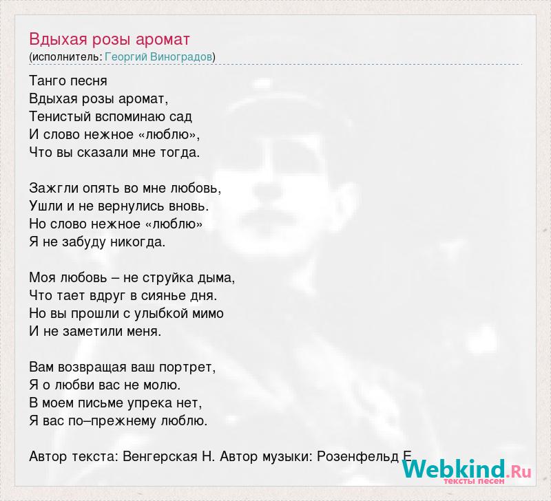 Танго песня Вдыхая розы аромат, Тенистый вспоминаю сад И слово нежное «люблю», Что вы сказали мне тогда. Зажгли опять во мне любовь, Ушли и не вернулись вновь. Но слово нежное «люблю» Я не забуду никогда. Моя любовь – не струйка дыма, Что тает вдруг в сиянье дня. Но вы прошли с улыбкой мимо И не заметили меня. Вам возвращая ваш портрет, Я о любви вас не молю. В моем письме упрека нет, Я вас по–прежнему люблю. Автор текста: Венгерская Н. Автор музыки: Розенфельд Е.