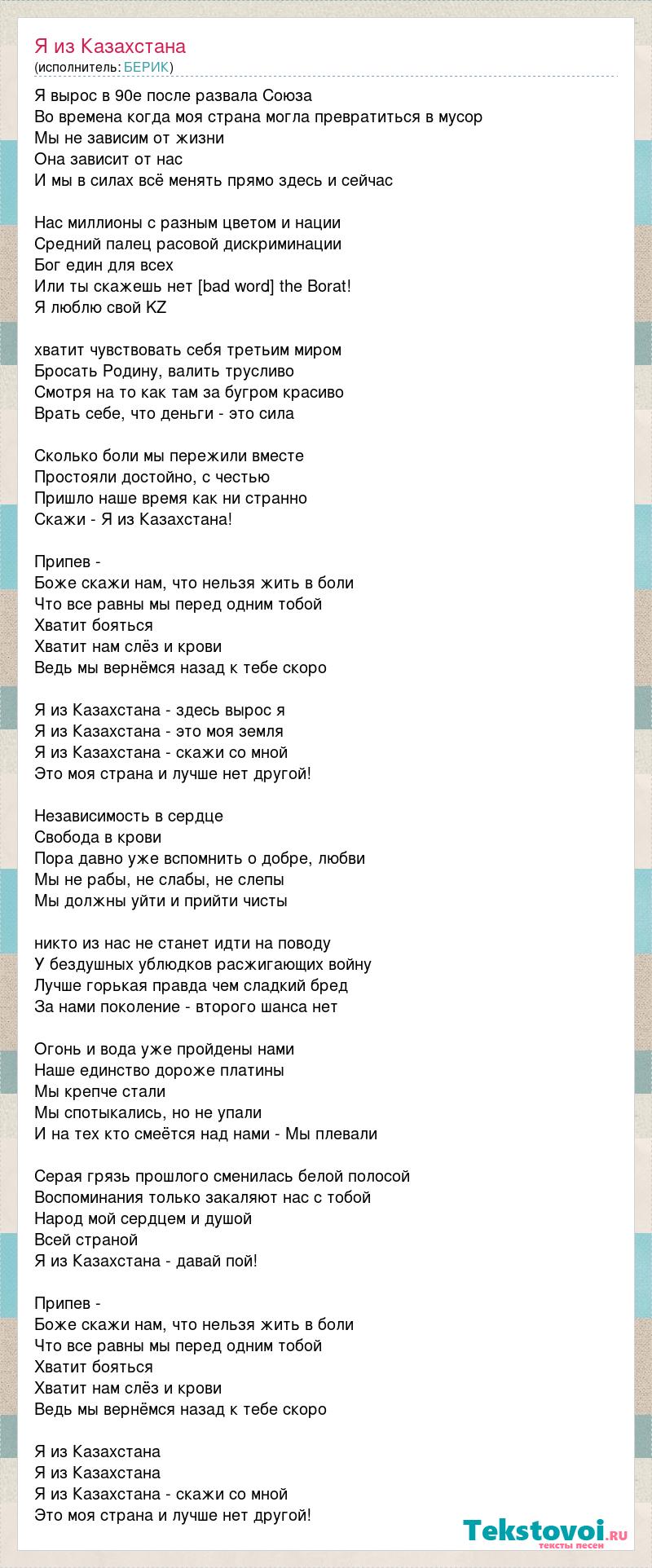 Я вырос в 90е после развала Союза Во времена когда моя страна могла превратиться в мусор Мы не зависим от жизни Она зависит от нас И мы в силах всё менять прямо здесь и сейчас Нас миллионы с разным цветом и нации Средний палец расовой дискриминации Бог един для всех Или ты скажешь нет [bad word] the Borat! Я люблю свой KZ хватит чувствовать себя третьим миром Бросать Родину, валить трусливо Смотря на то как там за бугром красиво Врать себе, что деньги - это сила Сколько боли мы пережили вместе Простояли достойно, с честью Пришло наше время как ни странно Скажи - Я из Казахстана! Припев - Боже скажи нам, что нельзя жить в боли Что все равны мы перед одним тобой Хватит бояться Хватит нам слёз и крови Ведь мы вернёмся назад к тебе скоро Я из Казахстана - здесь вырос я Я из Казахстана - это моя земля Я из Казахстана - скажи со мной Это моя страна и лучше нет другой! Независимость в сердце Свобода в крови Пора давно уже вспомнить о добре, любви Мы не рабы, не слабы, не слепы Мы должны уйти и прийти чисты никто из нас не станет идти на поводу У бездушных ублюдков расжигающих войну Лучше горькая правда чем сладкий бред За нами поколение - второго шанса нет Огонь и вода уже пройдены нами Наше единство дороже платины Мы крепче стали Мы спотыкались, но не упали И на тех кто смеётся над нами - Мы плевали Серая грязь прошлого сменилась белой полосой Воспоминания только закаляют нас с тобой Народ мой сердцем и душой Всей страной Я из Казахстана - давай пой! Припев - Боже скажи нам, что нельзя жить в боли Что все равны мы перед одним тобой Хватит бояться Хватит нам слёз и крови Ведь мы вернёмся назад к тебе скоро Я из Казахстана Я из Казахстана Я из Казахстана - скажи со мной Это моя страна и лучше нет другой!