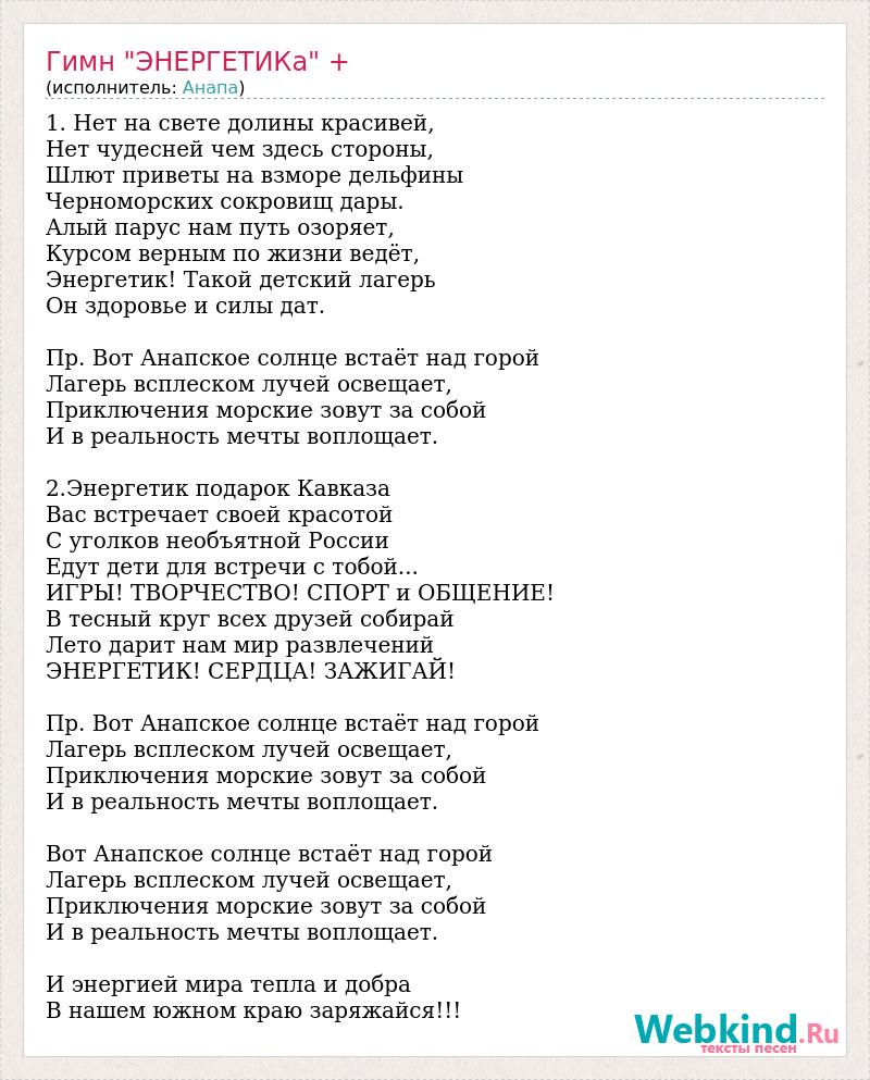 1. Нет на свете долины красивей, Нет чудесней чем здесь стороны, Шлют приветы на взморе дельфины Черноморских сокровищ дары. Алый парус нам путь озоряет, Курсом верным по жизни ведёт, Энергетик! Такой детский лагерь Он здоровье и силы дат. Пр. Вот Анапское солнце встаёт над горой Лагерь всплеском лучей освещает, Приключения морские зовут за собой И в реальность мечты воплощает. 2.Энергетик подарок Кавказа Вас встречает своей красотой С уголков необъятной России Едут дети для встречи с тобой... ИГРЫ! ТВОРЧЕСТВО! СПОРТ и ОБЩЕНИЕ! В тесный круг всех друзей собирай Лето дарит нам мир развлечений ЭНЕРГЕТИК! СЕРДЦА! ЗАЖИГАЙ! Пр. Вот Анапское солнце встаёт над горой Лагерь всплеском лучей освещает, Приключения морские зовут за собой И в реальность мечты воплощает. Вот Анапское солнце встаёт над горой Лагерь всплеском лучей освещает, Приключения морские зовут за собой И в реальность мечты воплощает. И энергией мира тепла и добра В нашем южном краю заряжайся!!!